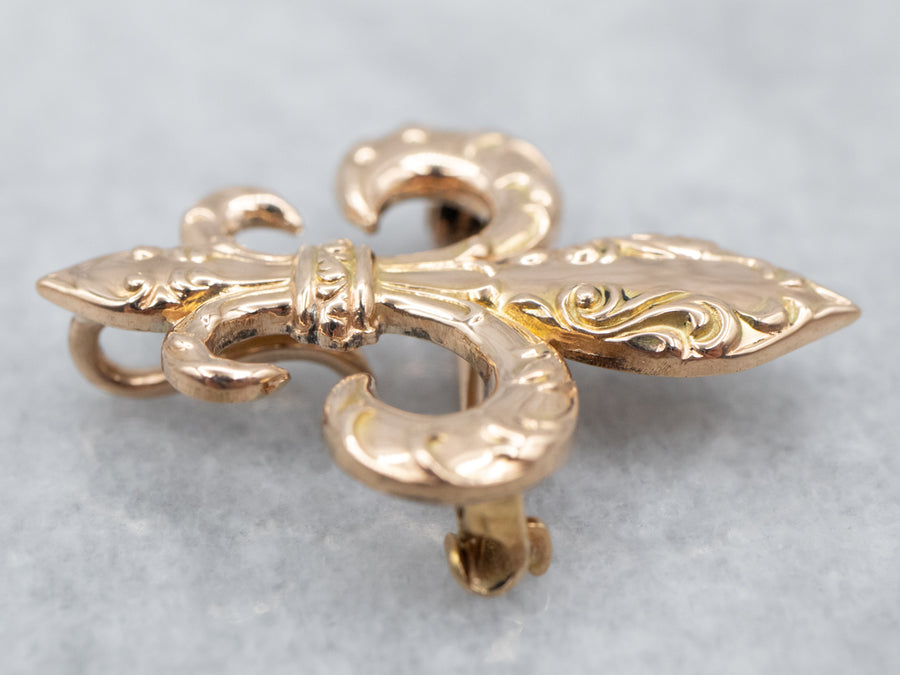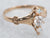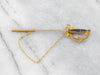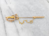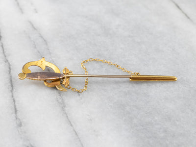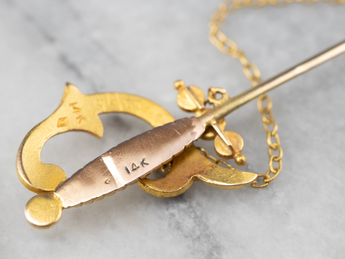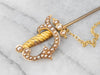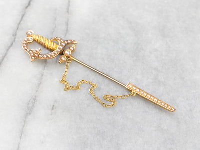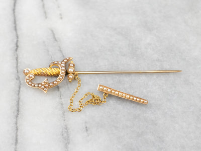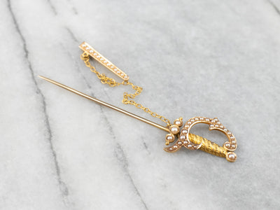 This antique stick pin is simply wonderful! The clever sword design comes with a gleaming sheath attached to a chain. Set into the handle and sheath are creamy seed pearls original to this antique piece. This brooch is perfect for wearing on a lapel or hat!
