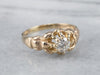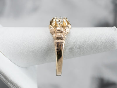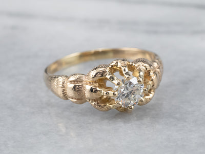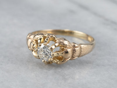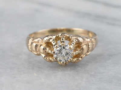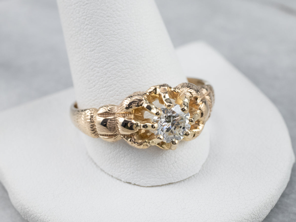 Textured gold combines beautifully with a classic Victorian style! This ring is crafted gold with waving etchings. In the center, a beautiful diamond is held in a claw-like mounting, the prongs rising out of the metal band on every side to hold the stone. Centered with a stunning 1.14-carat diamond, this is a great unisex piece, perfect for an engagement anniversary or birthstone!