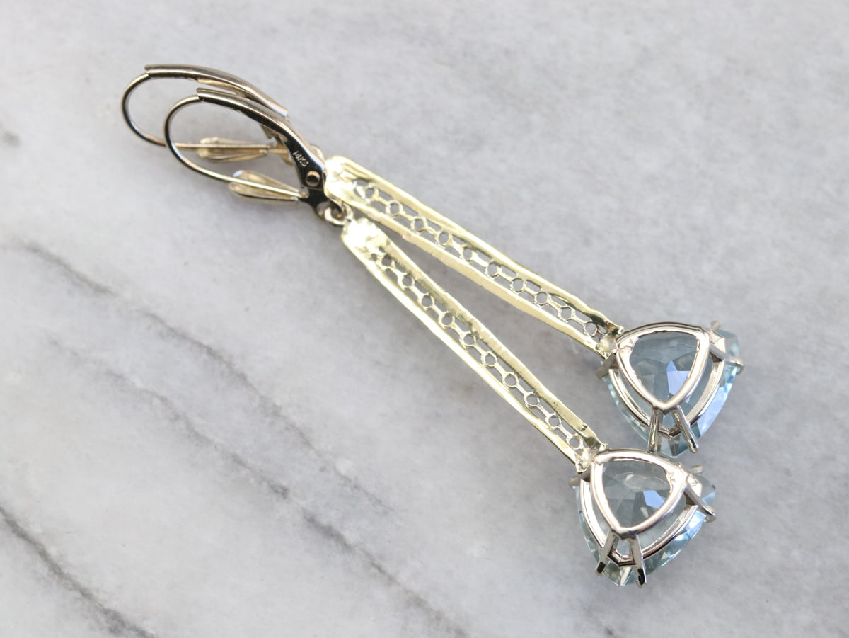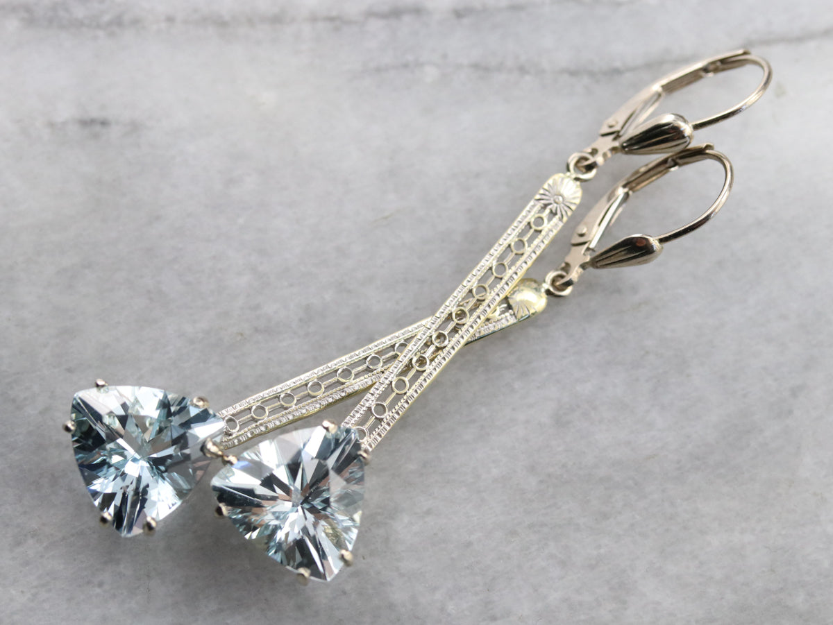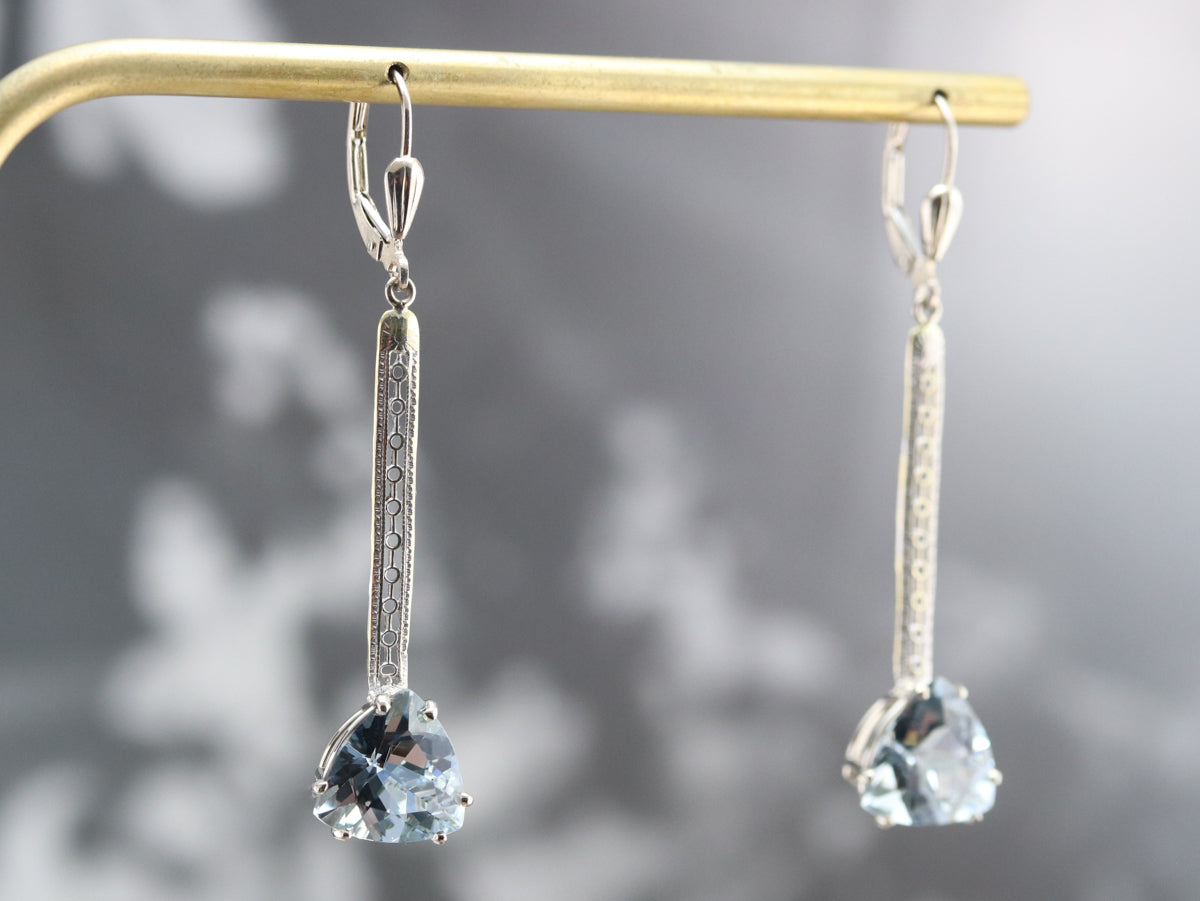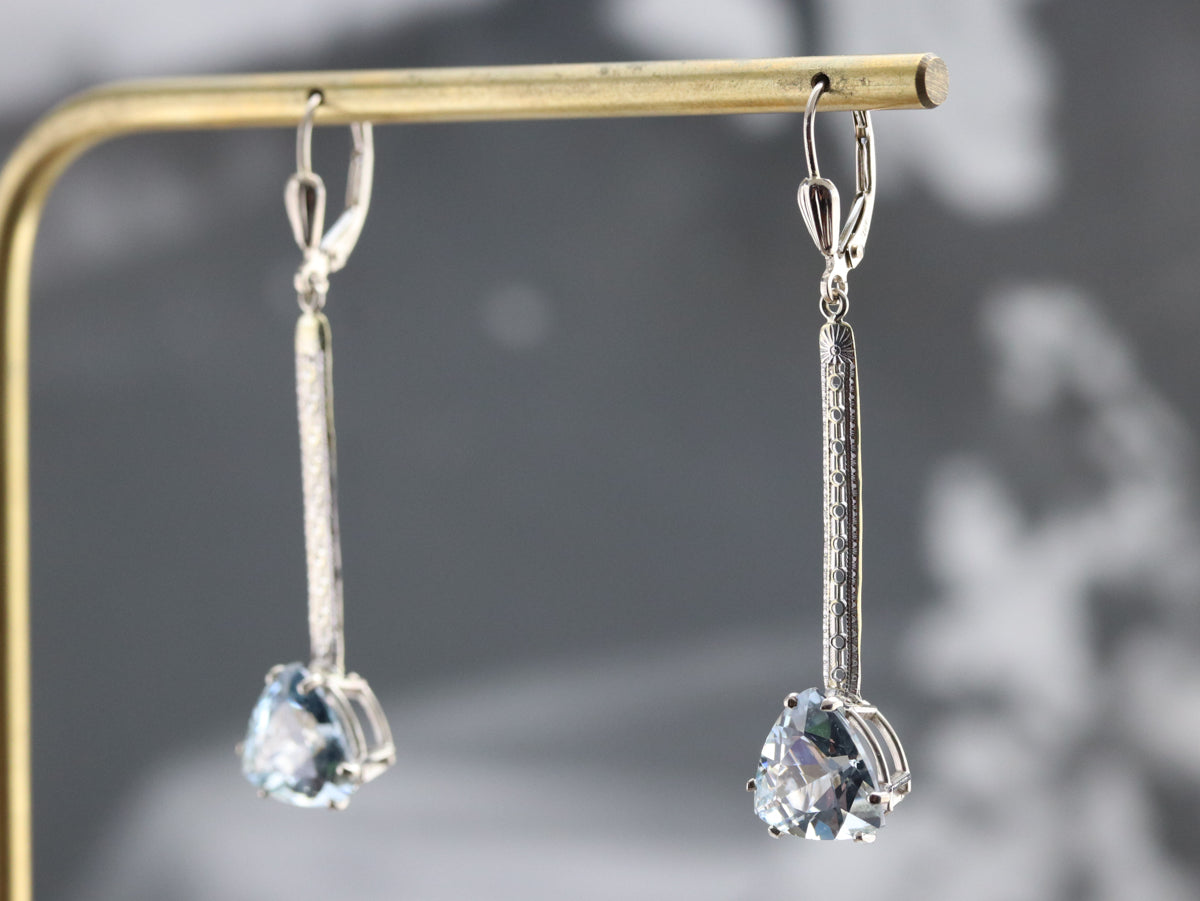 These earrings are lovely, a stunning something blue for the bride to be! The bar in the center is antique, beautifully textured white gold, filigree pieces taken from an Art Deco era bar pin. We've finished these with luscious, trillion cut aquamarine drops, icy and sparkling, the perfect finish to these long drop earrings!