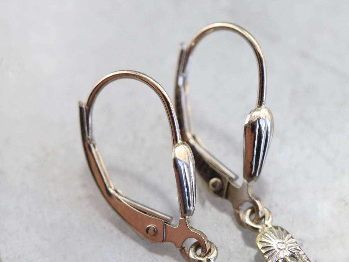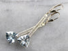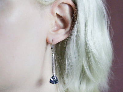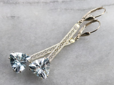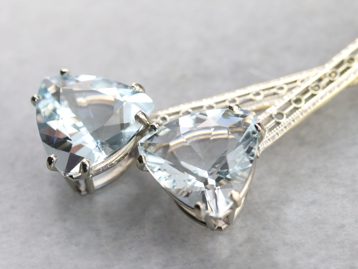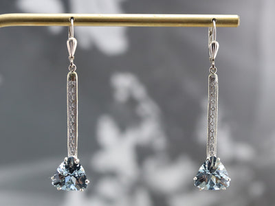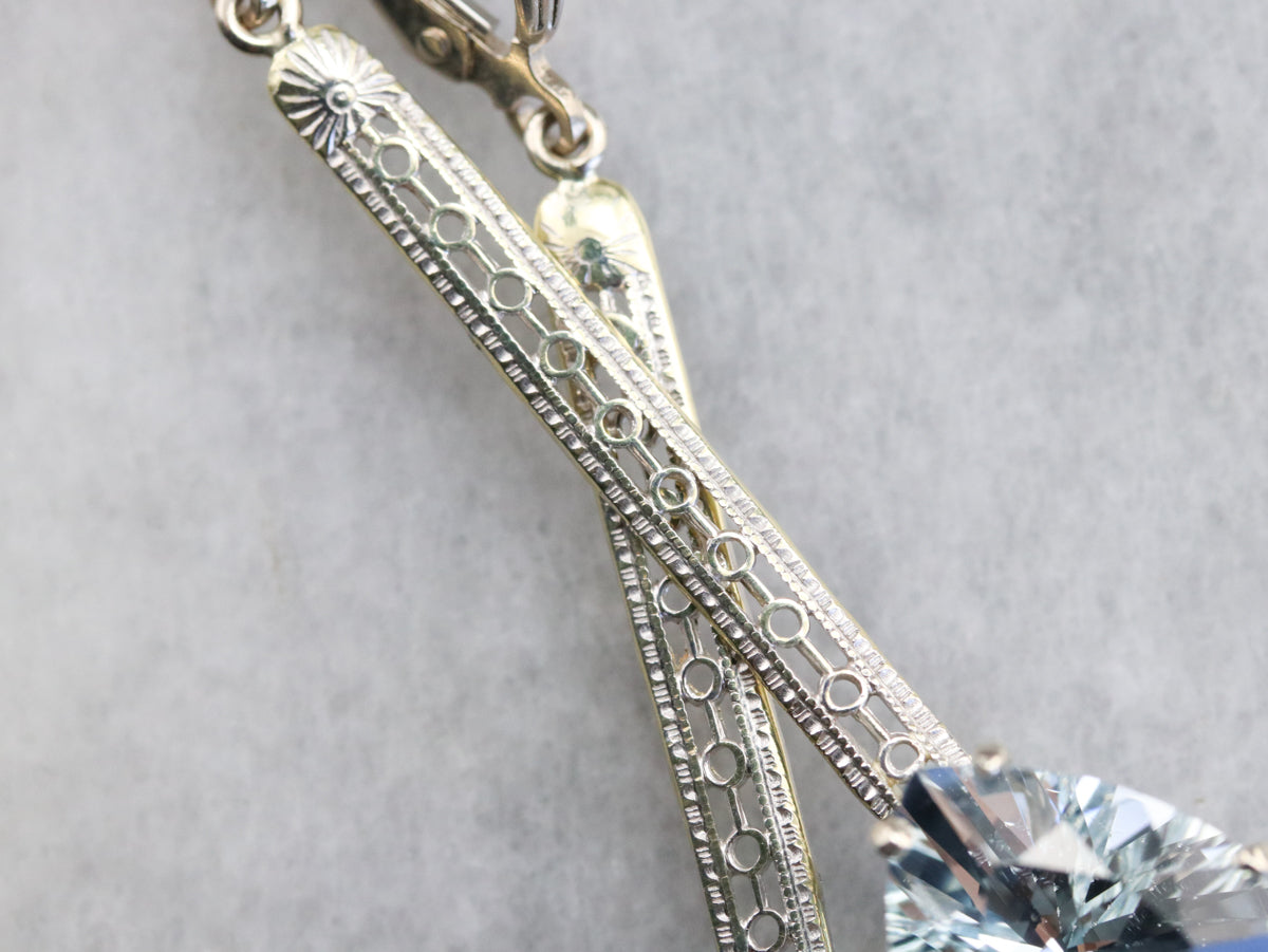These earrings are lovely, a stunning something blue for the bride to be! The bar in the center is antique, beautifully textured white gold, filigree pieces taken from an Art Deco era bar pin. We've finished these with luscious, trillion cut aquamarine drops, icy and sparkling, the perfect finish to these long drop earrings!