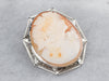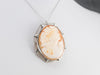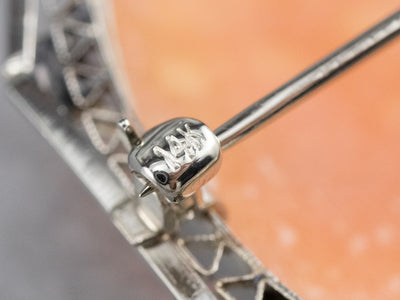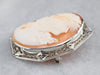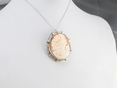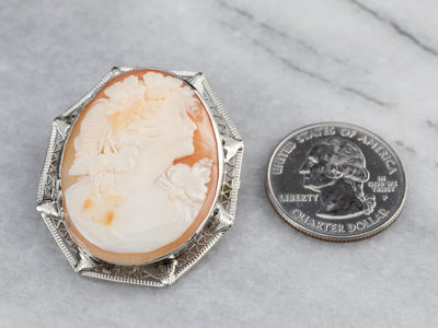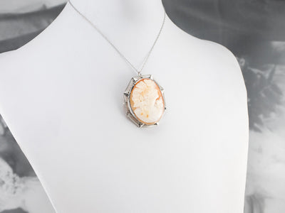 This Art Deco brooch pendant makes a lovely statement! The cameo is exquisitely carved and depicts a Bacchante maiden, her hair adorned with grapes and vines cascading gracefully down her shoulders. The filigree frame is accented by floral motifs that emphasize the botanical theme!