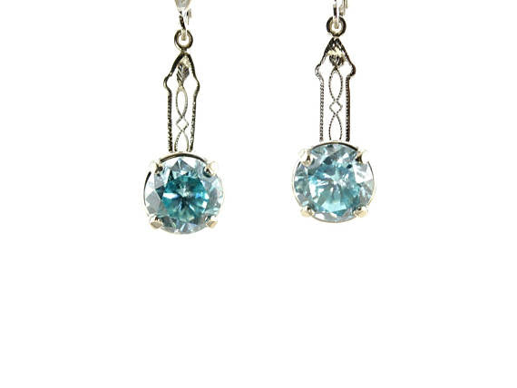The color of these perfectly matched blue zircons is absolutely intense! They are clear and crisp, with all of the rich, glittering blue of a winter sky over a snow-covered field. We've set these outstanding gems into a simple 4 prong settings that allow even more light to flow through the facets! Art Deco era filigree pieces give the earrings length and movement, while modern lever back findings are comfortable and secure in the ear.