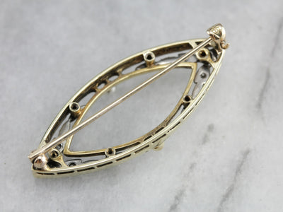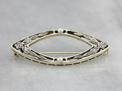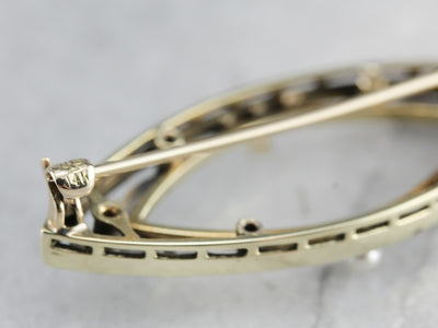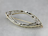 This pin is the very definition of the Art Deco era! Created by die stamping, even the finest filigree of this era is incredibly strong and tough. Feminine and sweet this pin will look lovely worn on a lapel or sweater... or even on a wedding veil or bouquet ribbon!