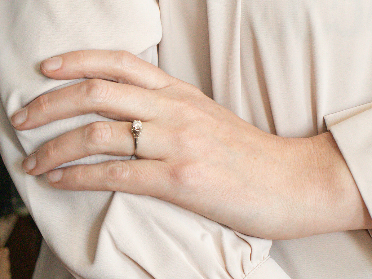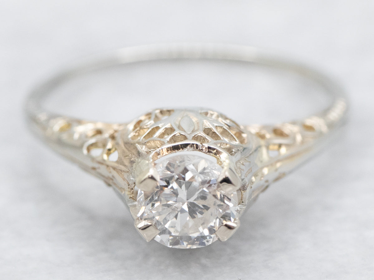Class, sophistication, and timeless quality. All of these adjectives come to mind when trying on this ring! This is a classic Art Deco engagement ring, scrolling filigree, beautifully accents the pretty center stone. The simple prongs and semi-bezel protect and frame the stone to perfection. This diamond is gorgeous and flashes back large swaths of light glitter from within this fantastic gemstone!