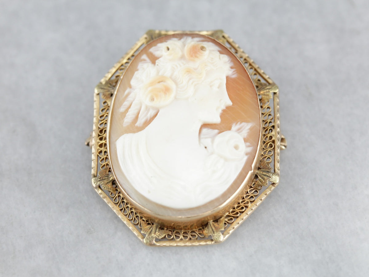This vintage brooch combines a wonderful classical portrait with an intricate filigree frame. The gold is yellow, with tints of green on the small, detailed leaves. The floral motif is carried over in to the lady's hair, with carefully carved roses perfectly placed to take advantage of the color of the shell. This can be worn as a pin or a pendant.