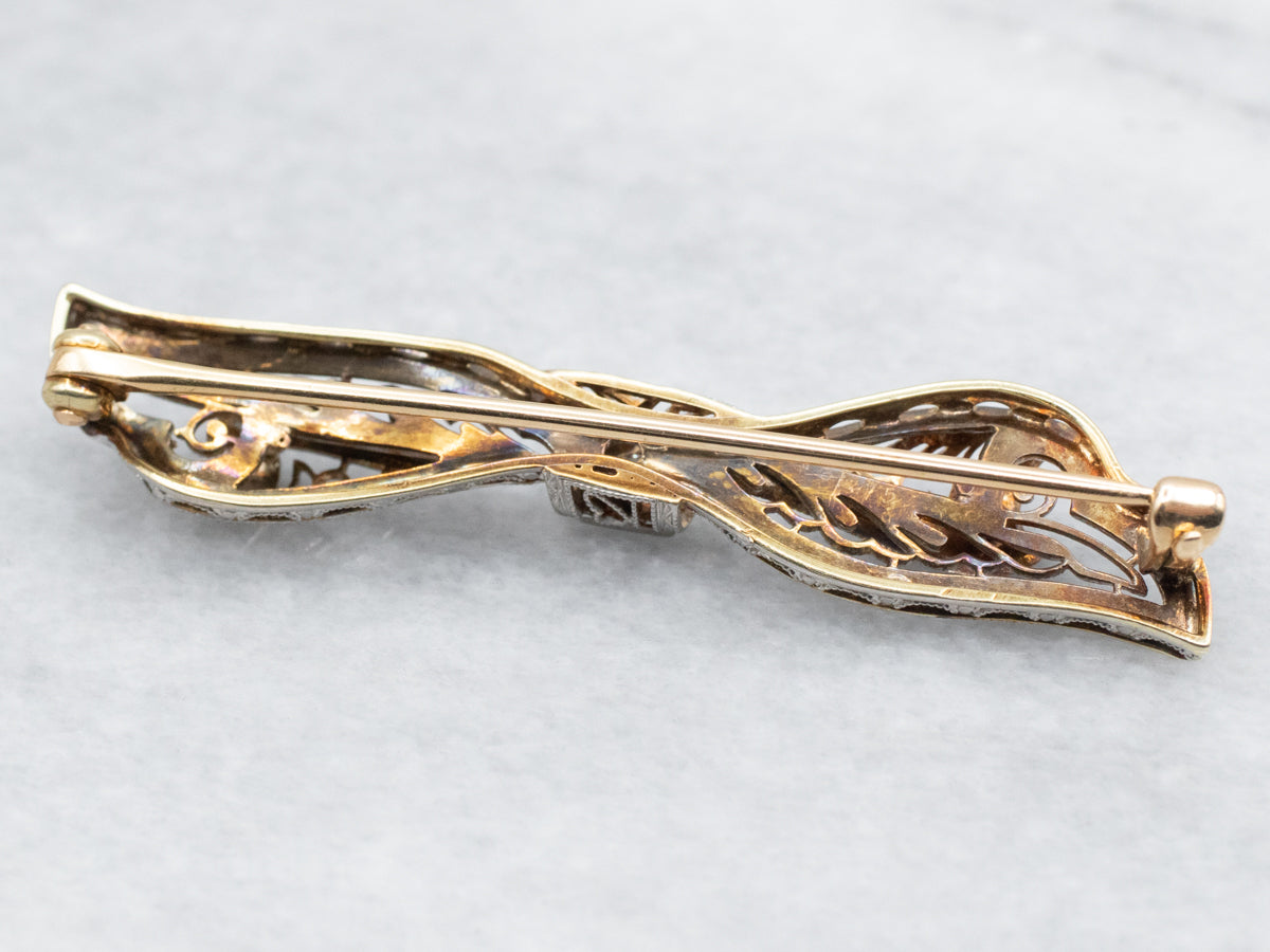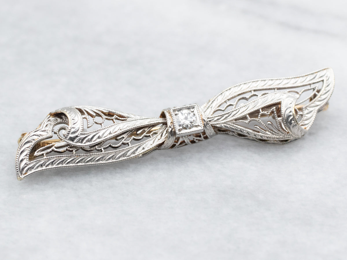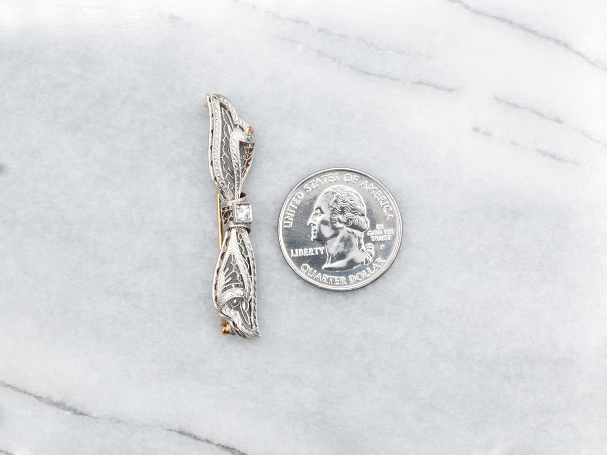 The delicate, lace-like diamond-centered filigree of this pin is the very definition of the Art Deco era! Created by die stamping, even the finest filigree of this era is incredibly strong and tough, a sweet sentiment for the one you love!
