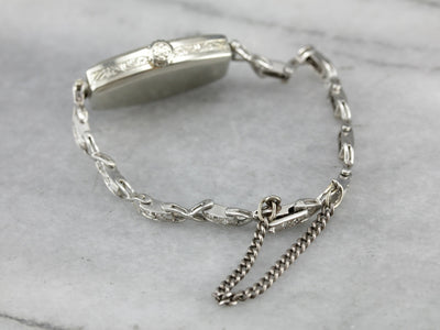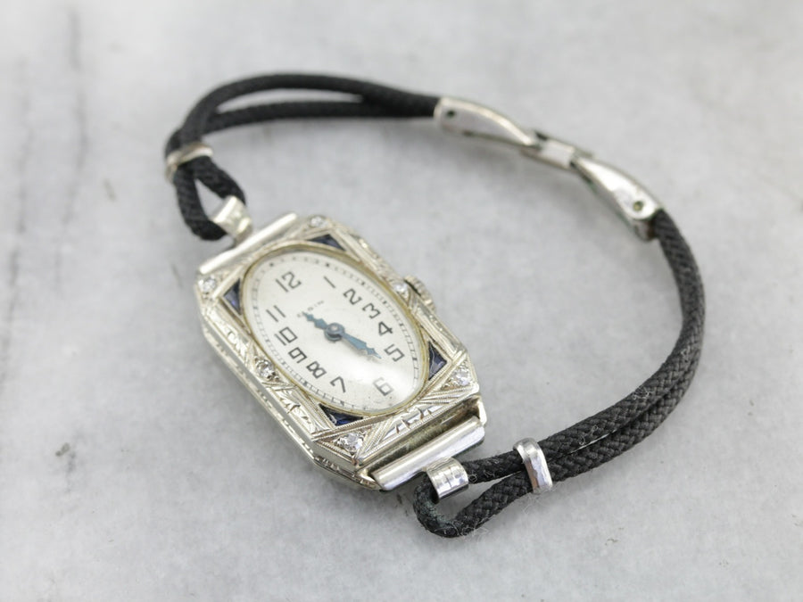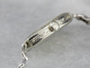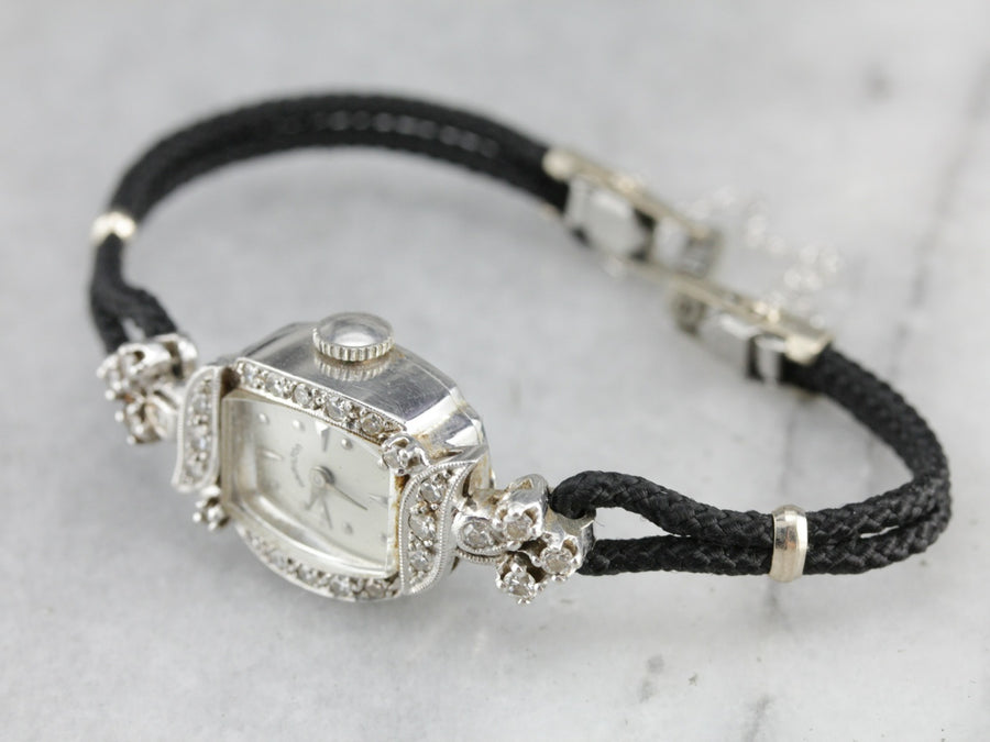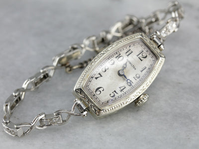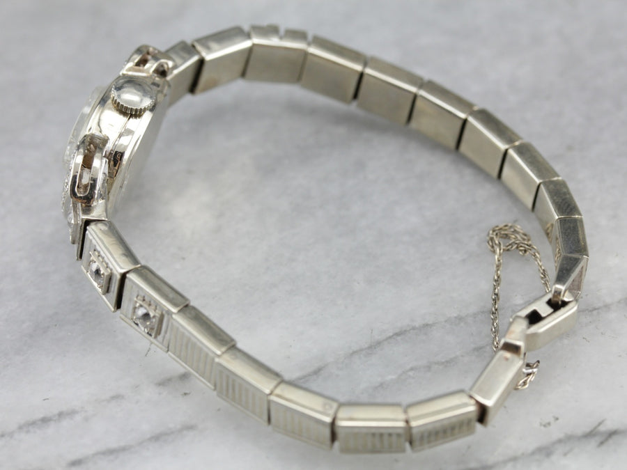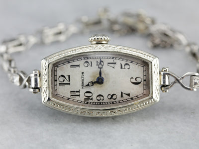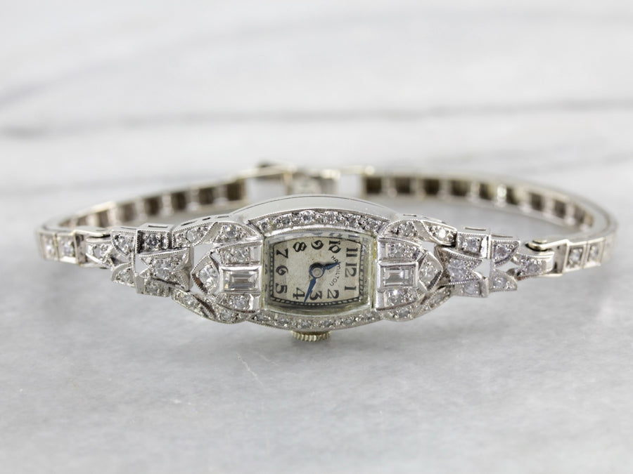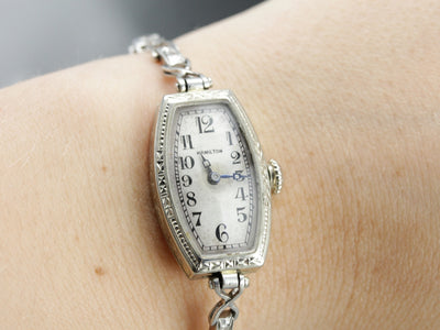 Crafted of 14 karat white gold and featuring a precision movement by renowned watchmaking company Hamilton, this vintage wrist watch has a luxurious feel upon the wrist. Glittering diamonds turn this from a timepiece into a piece of fine ladies jewelry. This beautiful ladies wrist watch is in excellent condition and, like all of our watches, has been restored and cleaned by a master watch craftsman.