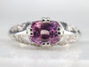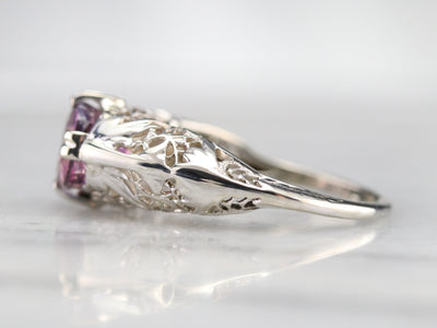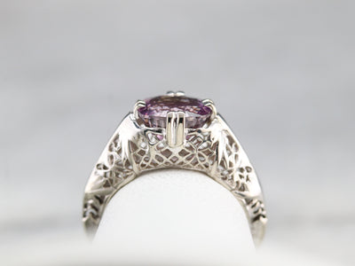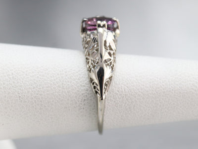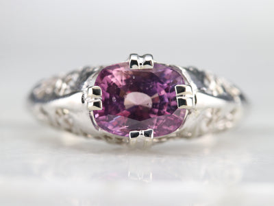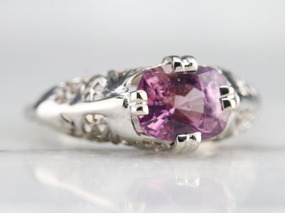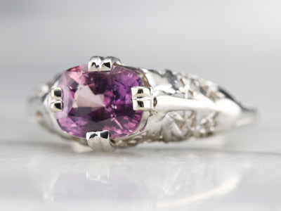 Outstanding! This vintage floral filigree ring is simply wonderful, and the bright white of the gold is perfectly set off by the sweetly hued pink sapphire. Worn as an engagement, birthstone or anniversary piece, this stunning solitaire is ready to wear or gift!