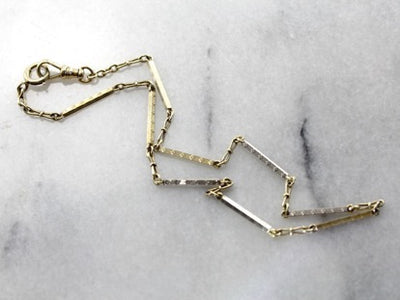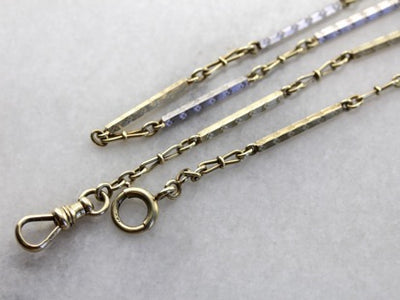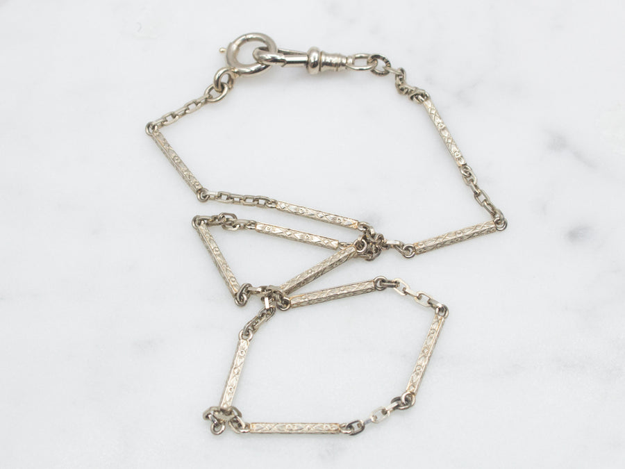 Dating to the end of the Art Deco period as it transitioned towards the Retro Era, this chain is detailed and eye catching!The craftsmanship is superb, each link forming a tiny work of art, each alternating link of green and white gold engraved with precise motifs. The use of the two colors of gold lends this chain the versatility to pair with any vintage pocket watch!