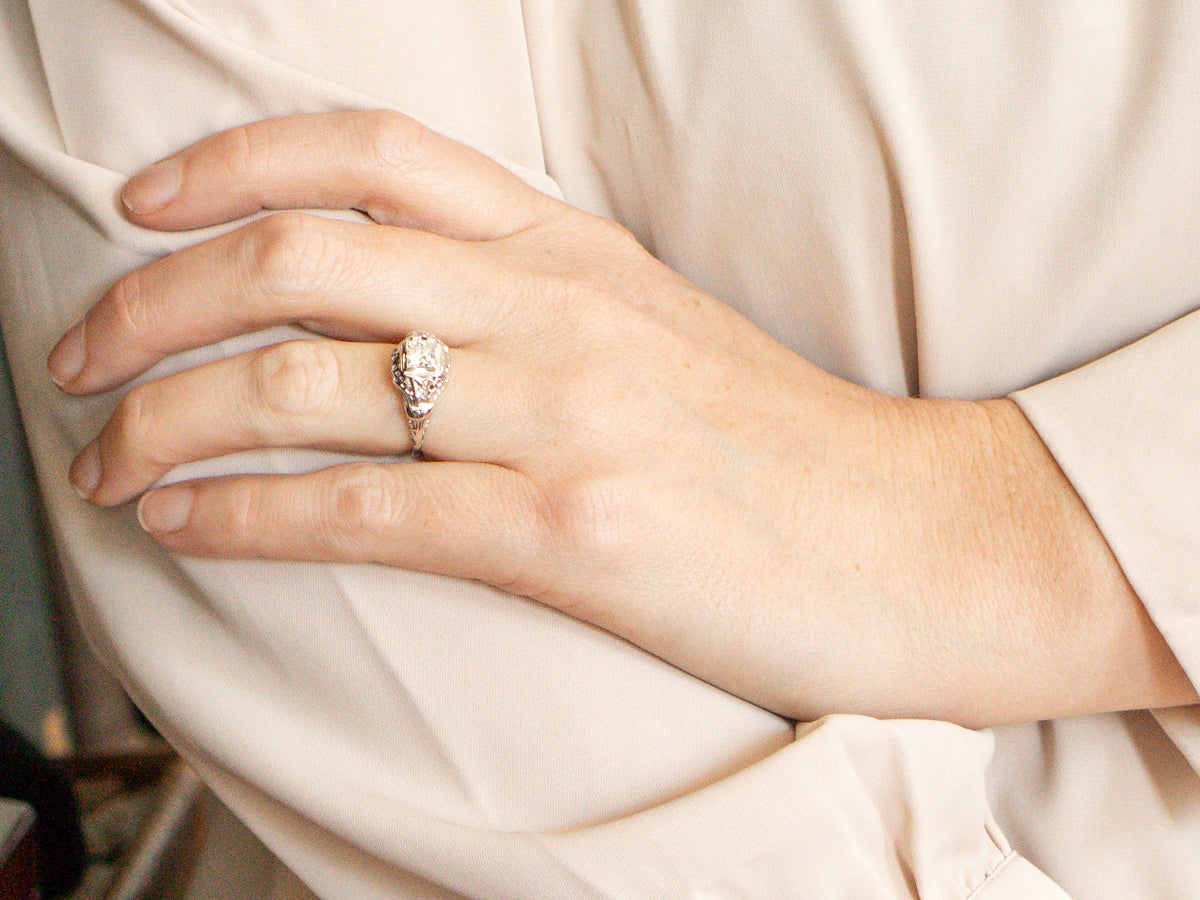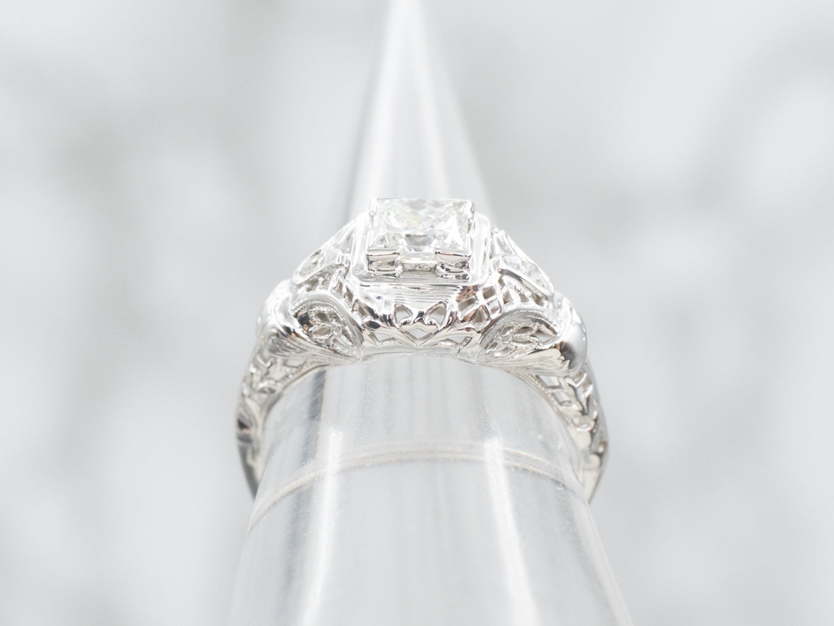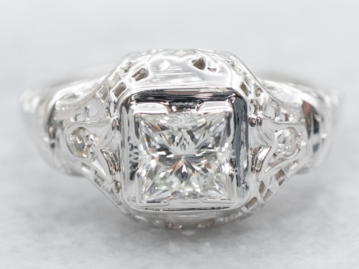 This Art Deco era engagement ring showcases a stunning princess cut diamond, complimented by diamond accents. With its vintage charm and expert craftsmanship, it is the perfect choice for a timeless and elegant proposal. Elevate your love story with this exquisite piece!