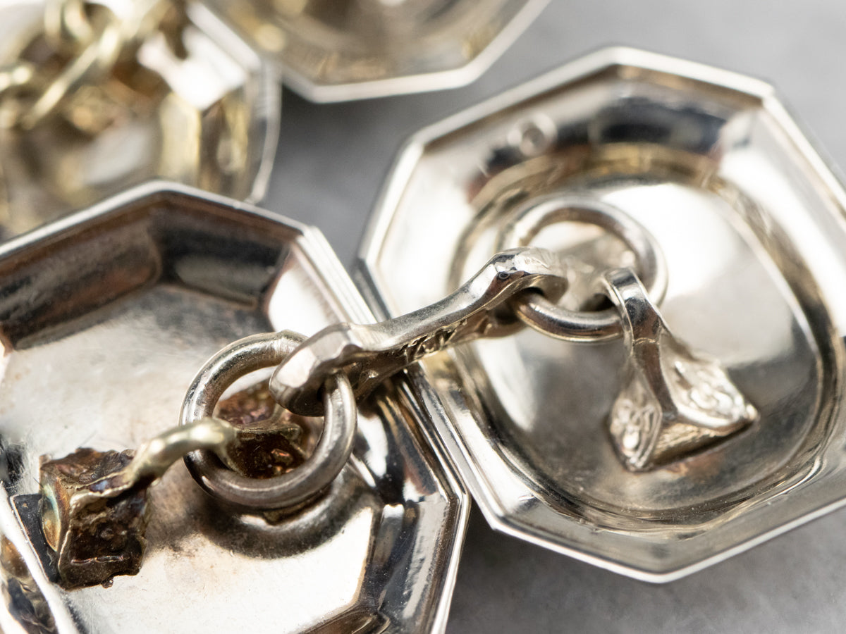 These vintage cufflinks are the very definition of sophistication. The metal is beautifully engraved white gold, worked in a classic pattern. These are completely decorated, making them reversible and elegant from any angle!