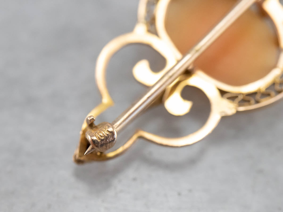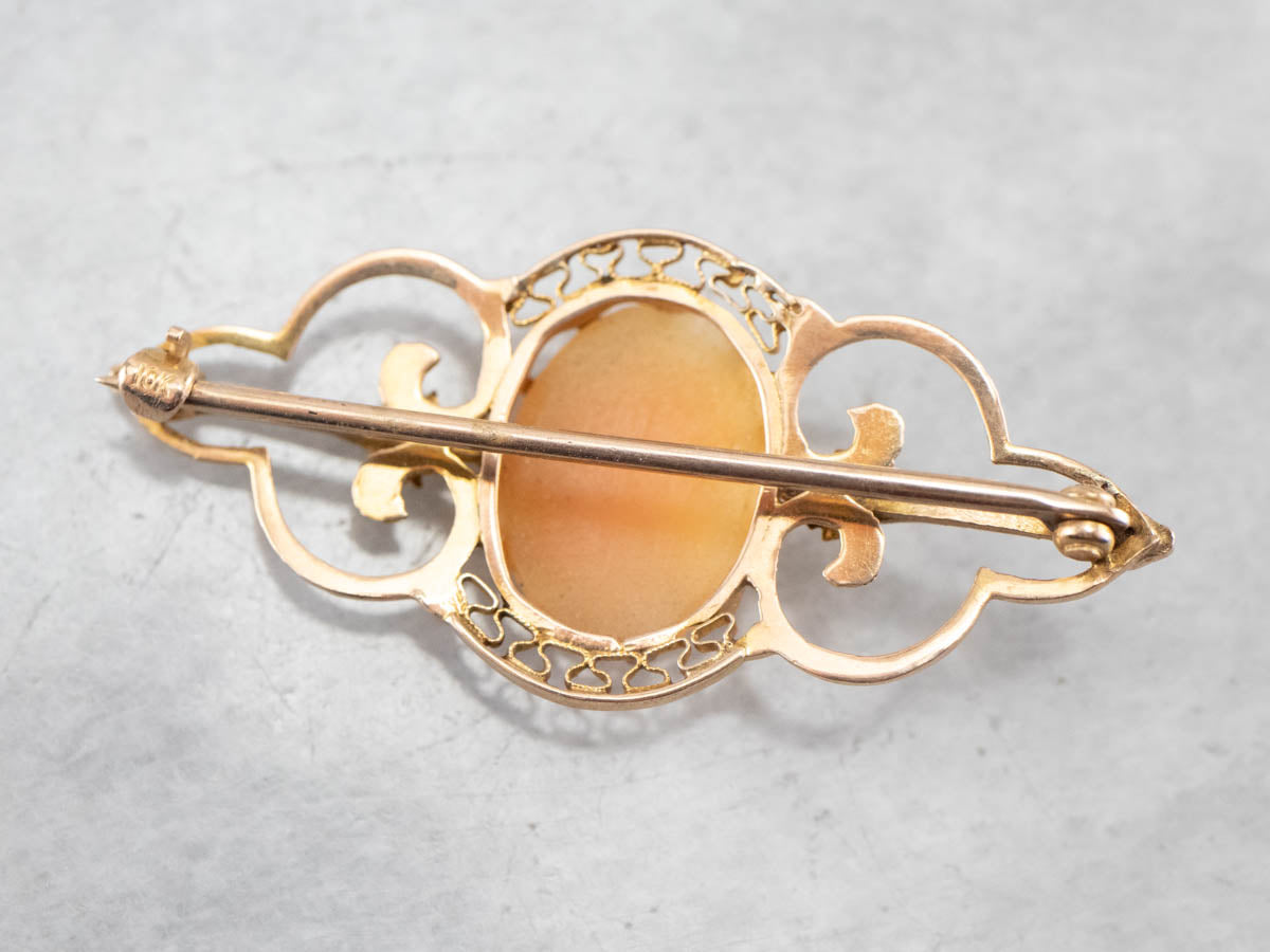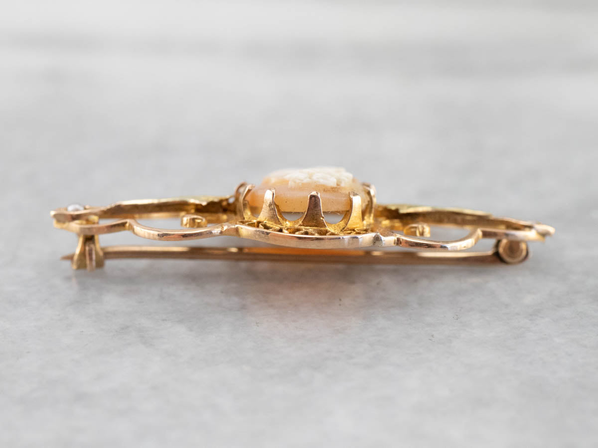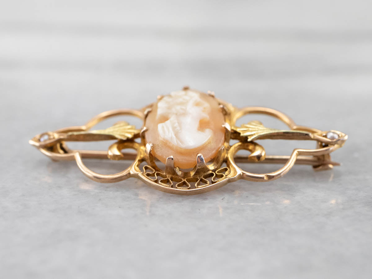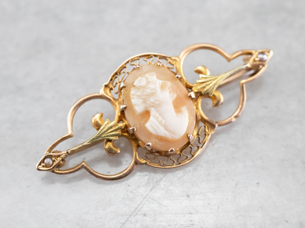 This antique cameo brooch is full of wonderful detail! Delicate looking filigree work, elongated fan motifs, and seed pearl accents all combine to form an exquisitely designed piece. The petite cameo at the center depicts a Roman style portrait, a motif traditional to the art form!