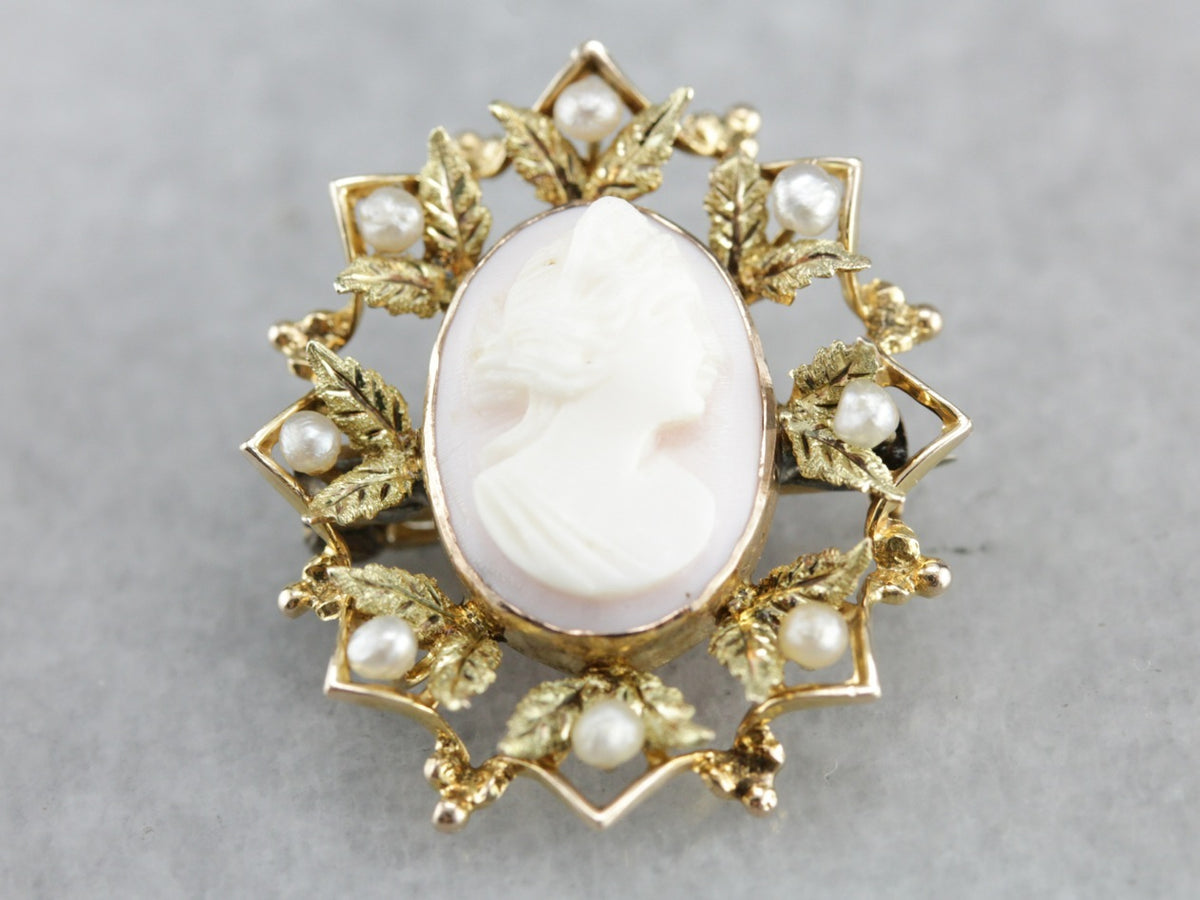 This pink shell cameo features wonderful, crisp details, and a great contrast between the creamy white carving and the soft pink of the background. A halo of seed pearls pulls the piece together, drawing on the color of the profile and the organic details of the gold.