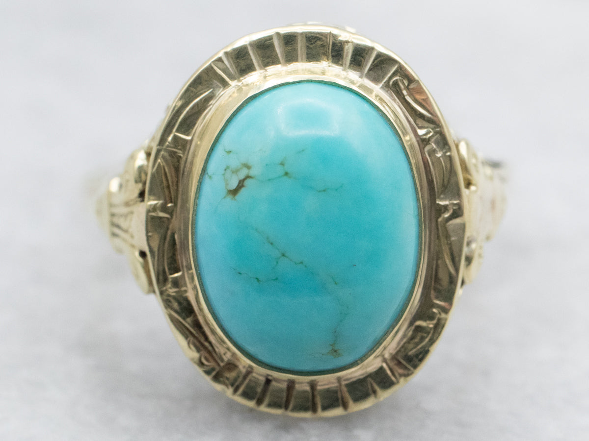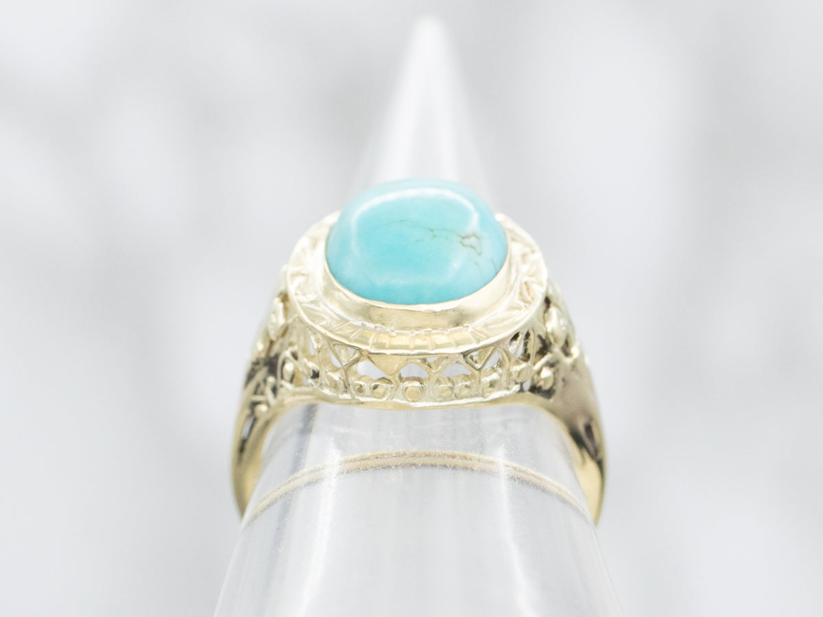 Add a touch of timeless elegance to your jewelry collection with this ring. The oval cut turquoise stone captures the beauty of Art Nouveau era, while the intricate filigree adds a delicate touch. This stunning ring is perfect for anyone looking to make a statement with a classic piece of jewelry!