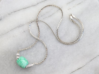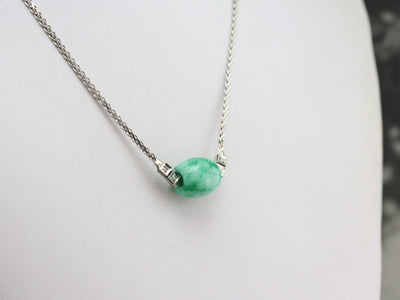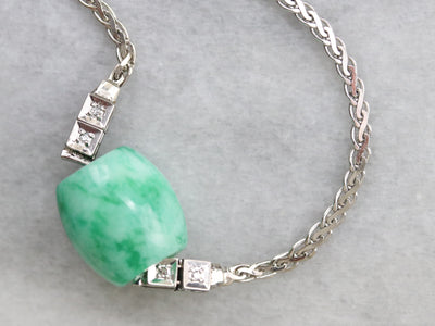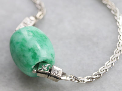 This is such a fun piece, both casual and luxurious all in one. The use of highly polished white gold along with the sparkling diamonds elevates this choker style chain to a chic statement piece. The bright green dyed jade center pops with color against the brightly polished gold!