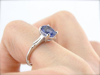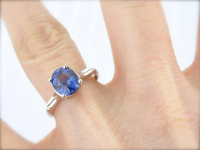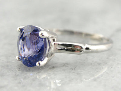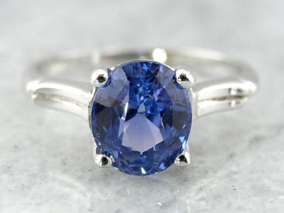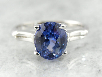 The perfect shade of blue, precision faceting and substantial carat weight combine in the precious gemstone to create a Ceylon Sapphire of benchmark quality. We've set this gorgeous sapphire in to a vintage Retro Era engagement ring of bright white gold, with simple curved shoulders to frame the stone without detracting from it's beauty.