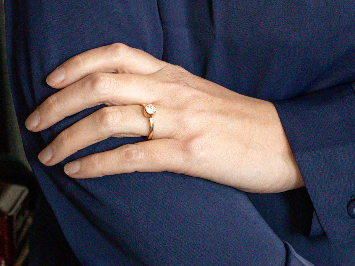 A sleek style with a minimalist profile! This plain solitaire diamond ring is as simple as it comes, yet has a lot of impact with its bezel-set design. A round brilliant radiant cut diamond sits atop a flat and plain polished yellow gold band, making this the perfect engagement piece for a lady with loves simplicity!