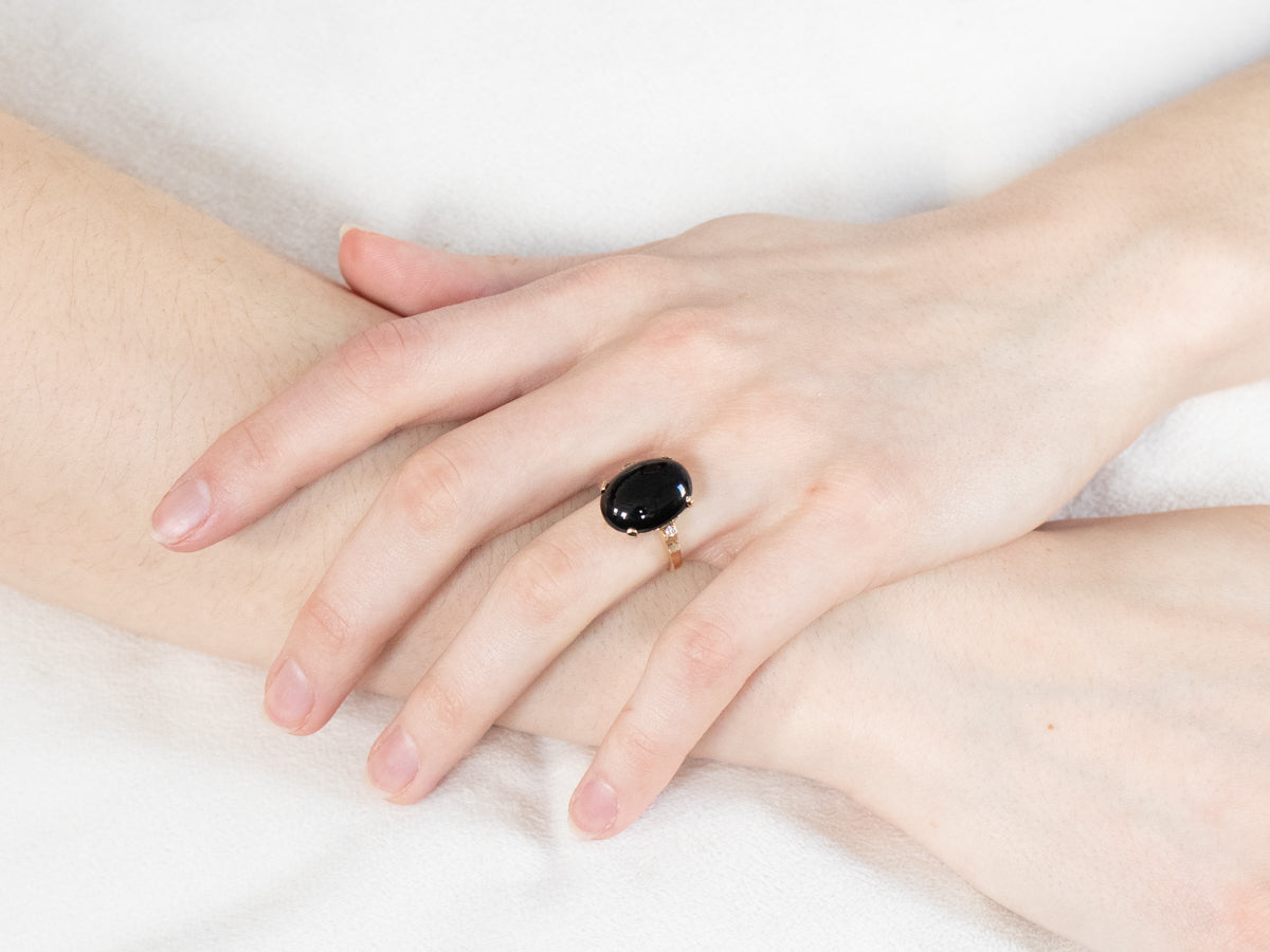 This black onyx ring is sleek and stylish! The 14k yellow gold prong setting creates a striking contrast against the deep, dark hue of the shining onyx. Brightly sparkling diamonds add lots of elegance and create a nice balance against the elongated cut of the center stone.