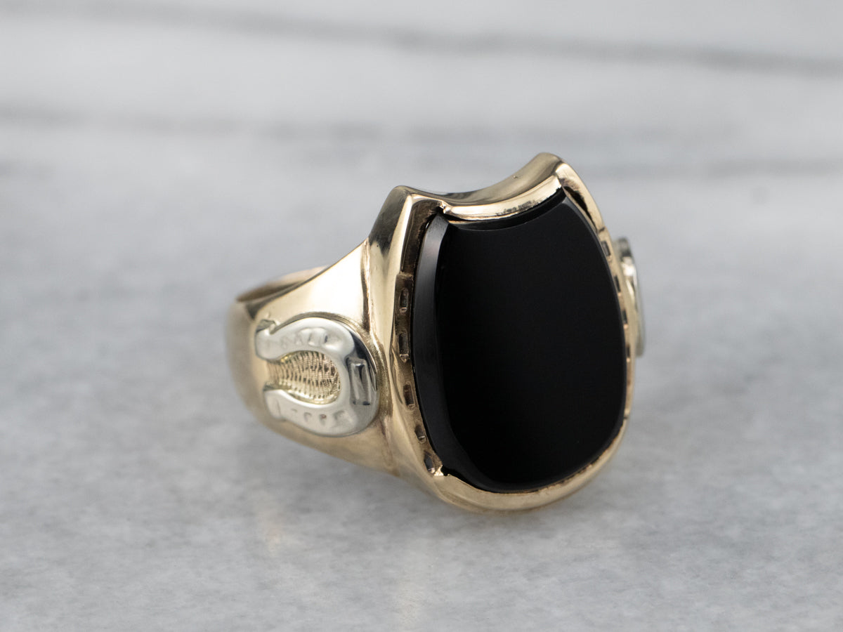 Feeling lucky? This unique piece sports a highly polished black onyx cut into the shape of a horseshoe, a motif that is reinforced by the 10K gold horseshoes that also adorn the shoulders of this piece. Perfect to slip on before you hit the casino, or as a special gift for that horseback rider or farmer in your life!