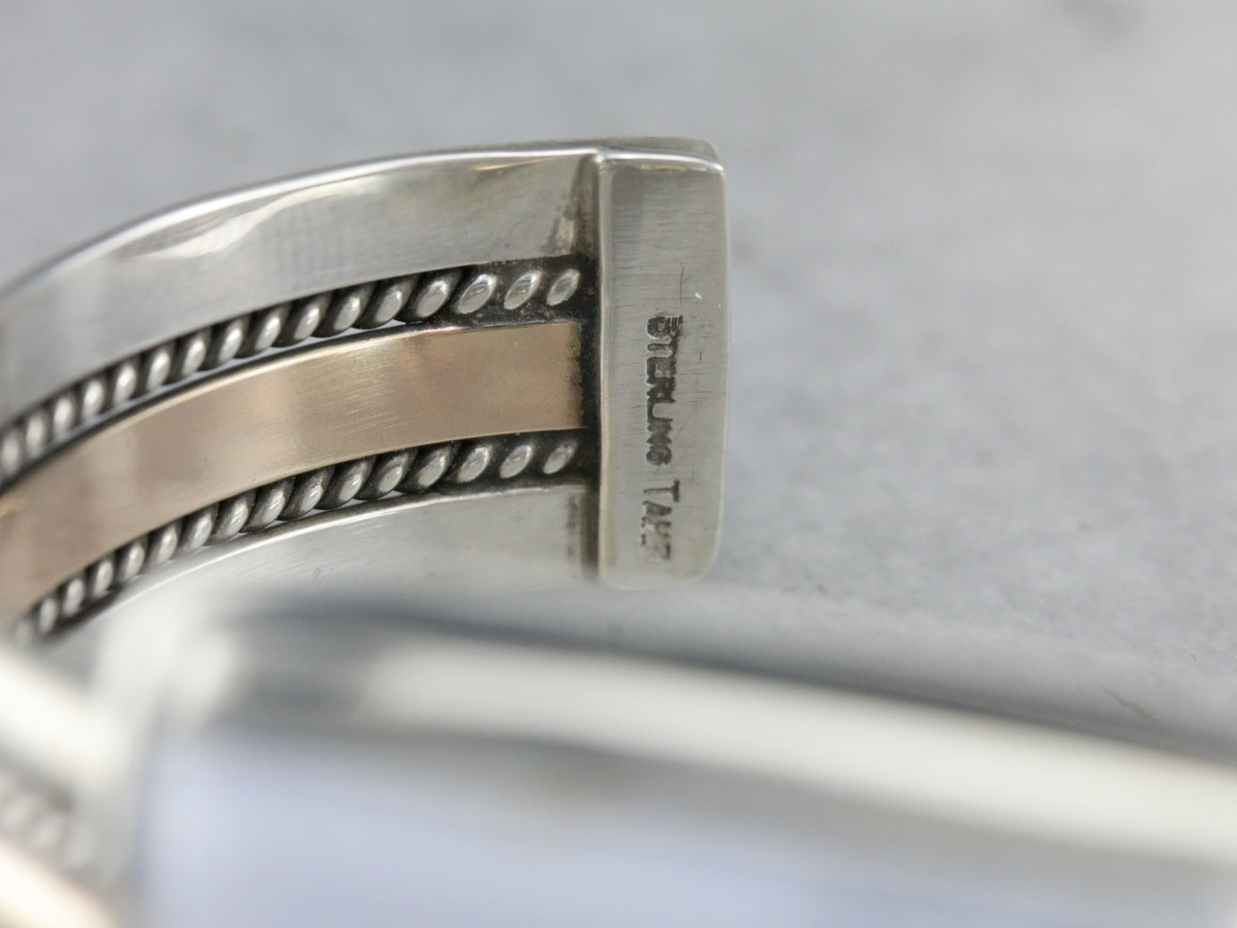 We've updated this vintage Taxco sterling silver and gold fill cuff with a stunning piece of blue lace agate, bands of lavender fill the center of this highly polished cabochon, sized to be noticed this is a fantastic statement piece that will go with a variety of metals!