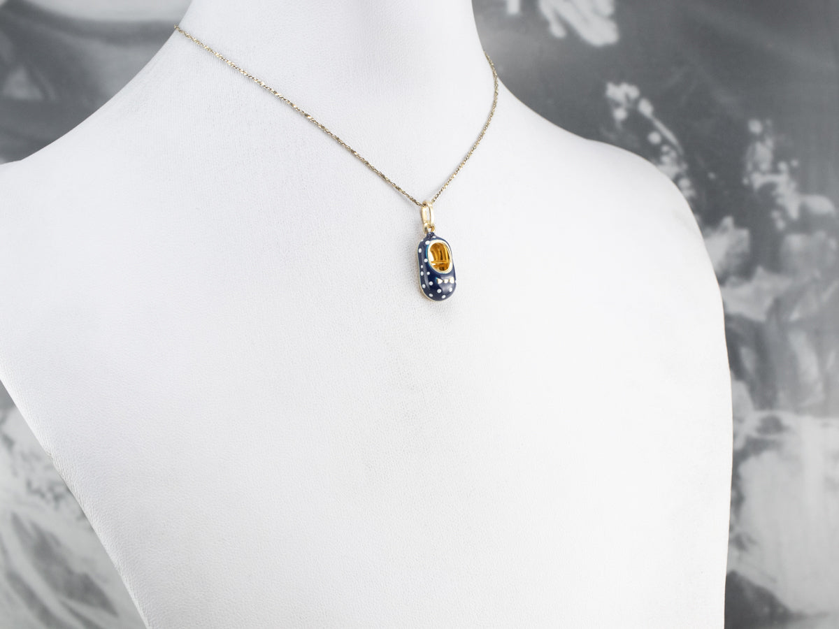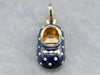 This shoe charm is adorable! White and blue polka dot enamel gives this piece a retro look, topped with a sweet bow. This lovely piece could be worn as a charm on a bracelet or a pendant on a chain!