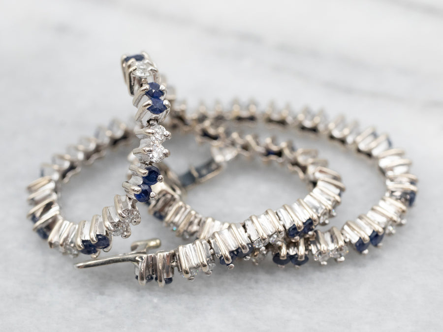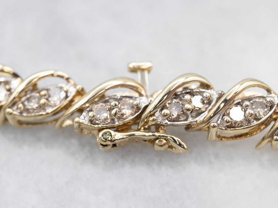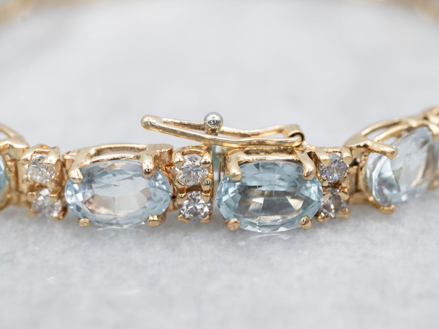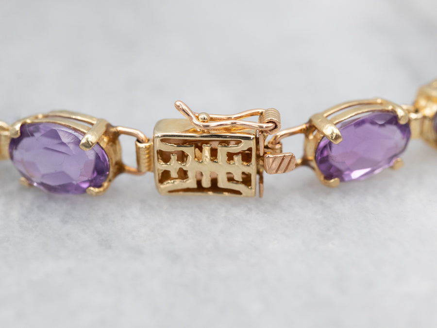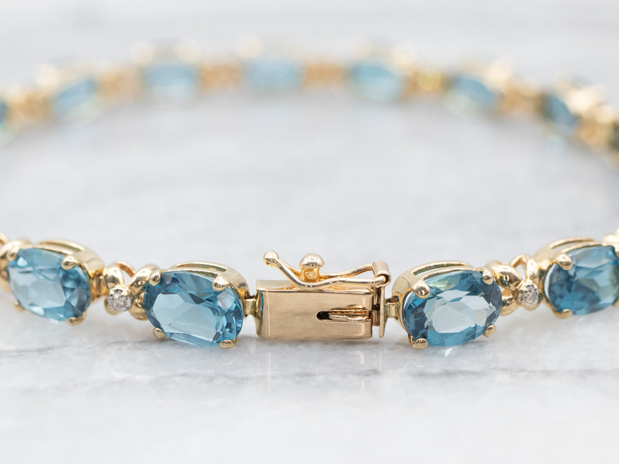 Breaking from the traditional tennis bracelet just a little bit, this piece is a beauty with a bit of flair! Each tanzanite is set in it's own setting, secure under four tight prongs. In between each stone is a small, highly polished, x shaped link of polished gold. Bright diamonds bring light and life in to this piece.