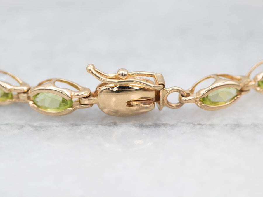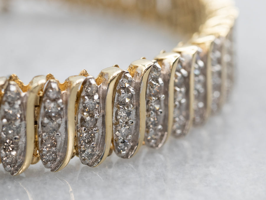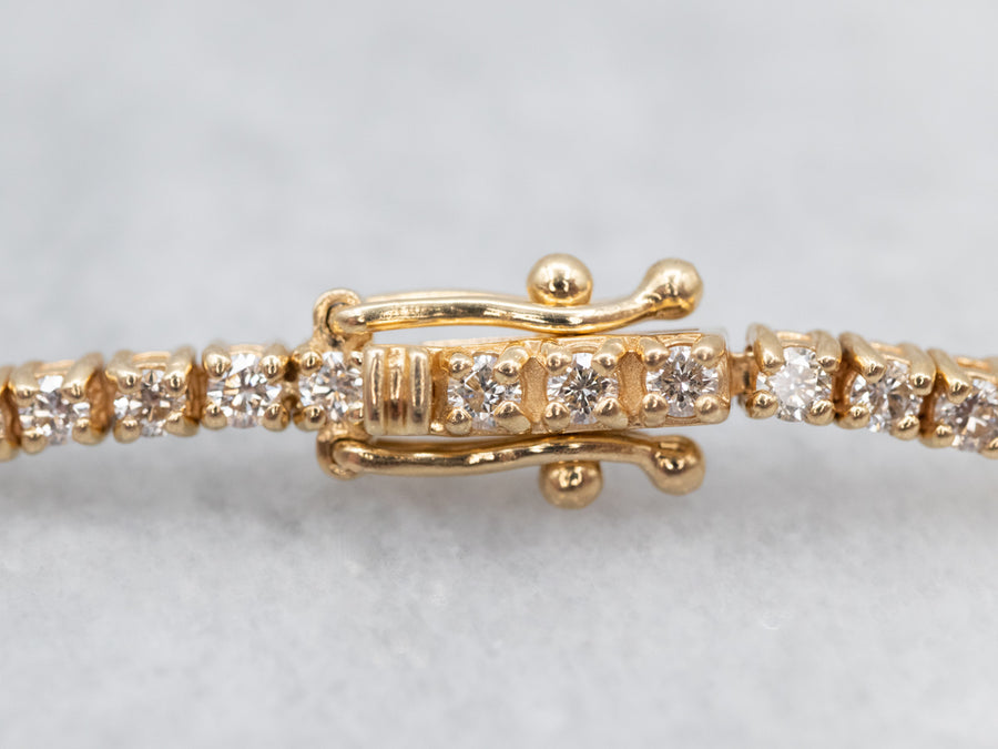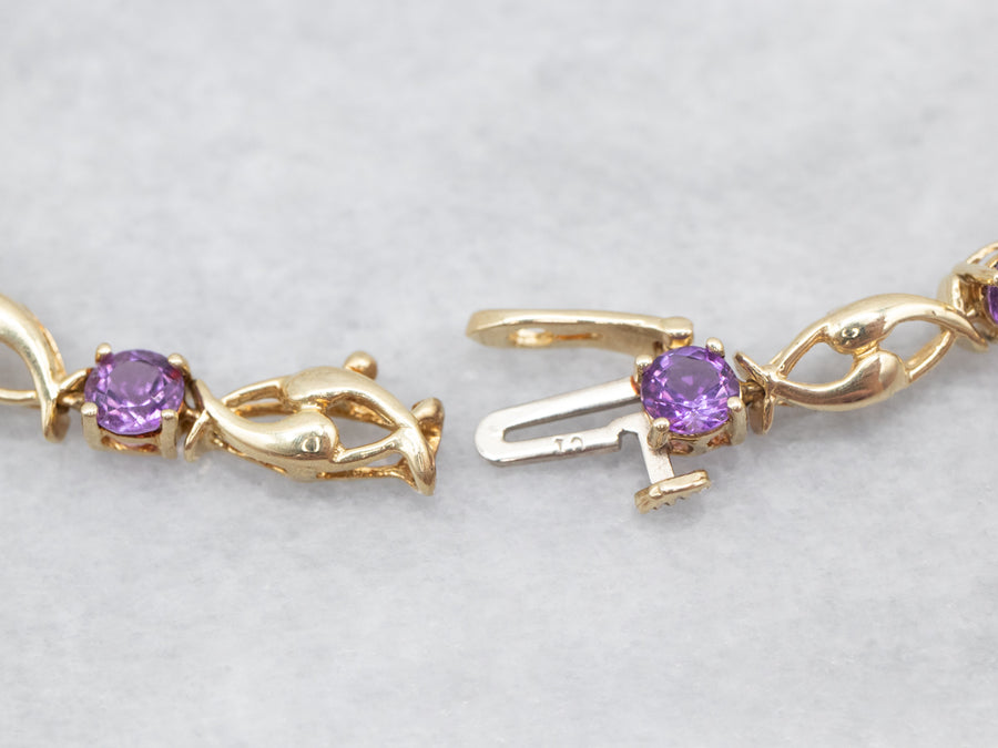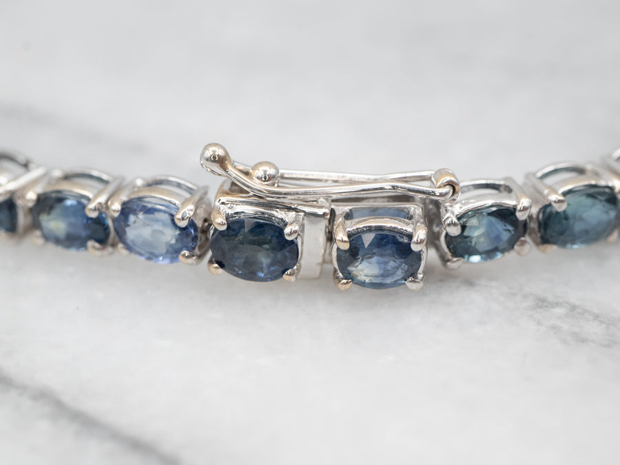 Breaking from the traditional tennis bracelet just a little bit, this piece is a beauty with a bit of flair! Each tanzanite is set in it's own setting, secure under four tight prongs. In between each stone is a small, highly polished, x shaped link of polished gold. Bright diamonds bring light and life in to this piece.