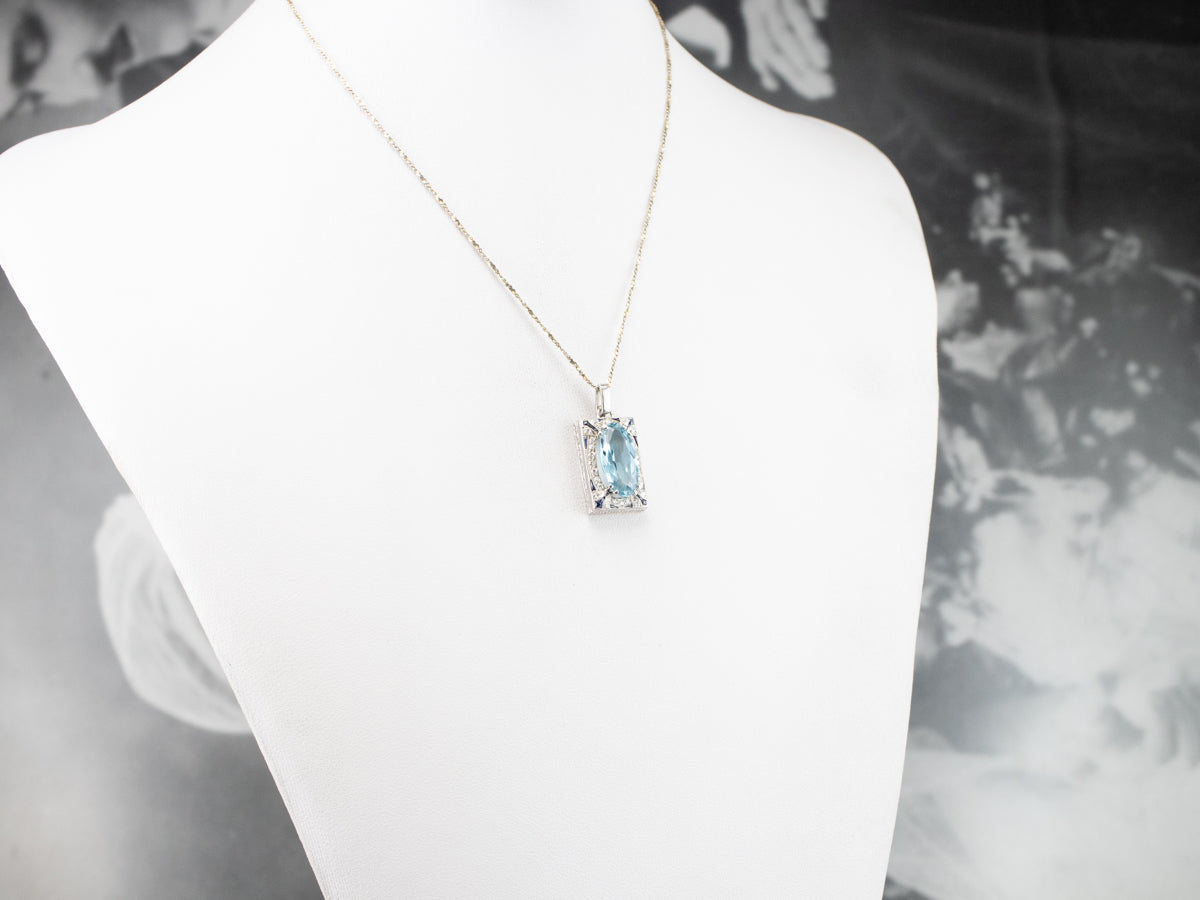 We've set this gorgeous, eye catching blue topaz gemstone into a fitting frame: an Art Deco diamond and white gold mounting that started its life as the face of a ladies wrist watch. This is a red carpet worthy pendant that echoes the luxury of the Roaring Twenties!