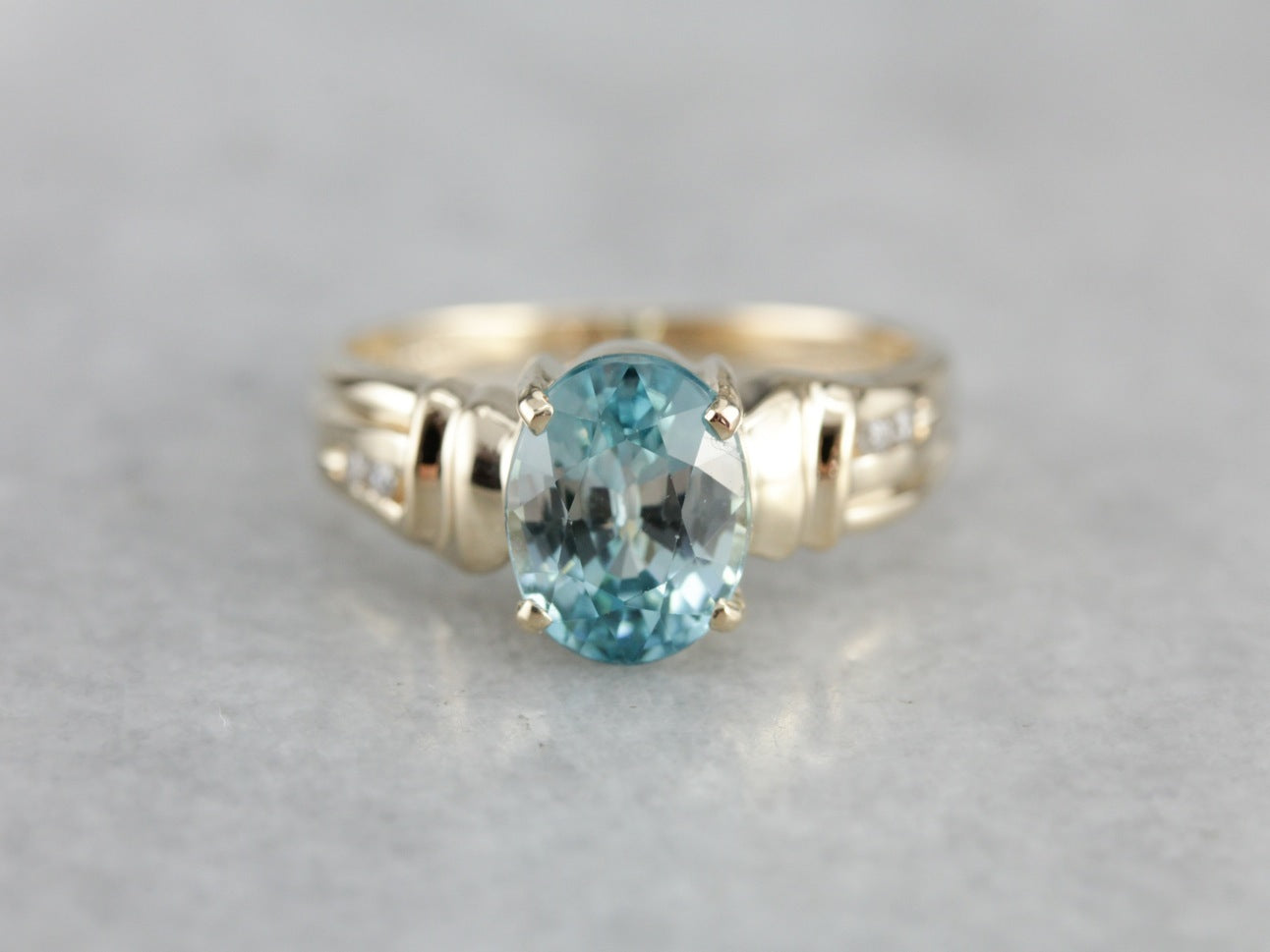 The lovely, blue-green shade of this zircon is amazing, and the oval cut of the stone allows it to be sparkly and display the stones unique double refraction. Zircons are a unique natural stone and are a stone with some of the most double refractivity; meaning that every single facet produces two reflections, instead of most stones which will produce only one reflection. Simply put, that feature of Zircons makes them super sparkly! We've set this stone in a modern setting, featuring a simple design inlaid with diamonds.