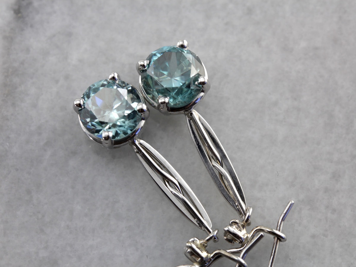 These earrings are truly memorable! The beautiful, luscious blue zircon stones are perfectly framed by the white, polished gold. We have created these earrings using decorative links from an antique chain, long bars that were once a part of a vintage pocket watch chain! These details give the earrings a lovely length, and add a unique element to their profile!