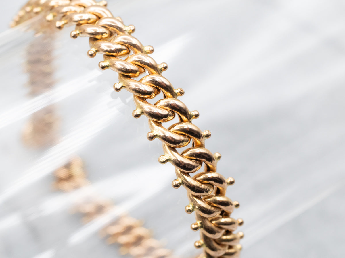 Curb-like links are brought together by a spring ring clasp, ensuring secure all day wear. Beads of gold adorn the links, giving unique dimension. Worn alone or stacked with others, this bracelet is perfect for everyday wear.
