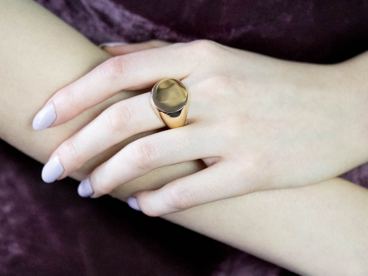 This is a hefty, thick and solid piece with no decoration or motifs to mar the amazing finish. Signet rings have a long history. Originally carved with a Family Crest, they were used to seal letters and documents by embossing the crest in wax. Over time they have evolved into day to day jewelry, which can be engraved with any crest, monogram or initial one desires.
