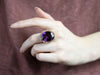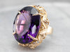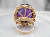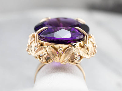 This amethyst statement ring is a real showstopper! The mounting is ornate and botanically inspired, with leaves and berry accents that could almost be plucked from a garden. The centerpiece is a royal purple amethyst, glittering from every angle and rich with pinkish violet undertones.
