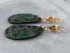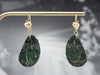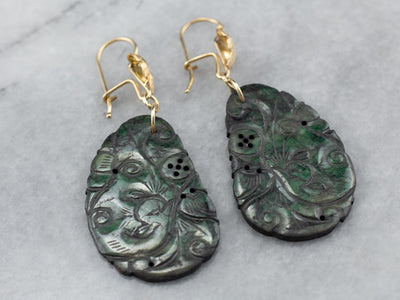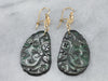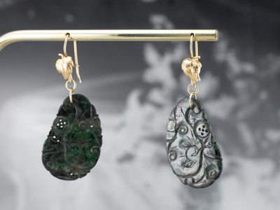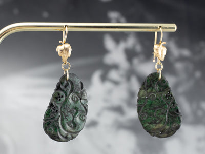 These jade drop earrings are wearable works of art! A deep forest green, the jade is carved with organic, botanical themed lines and motifs in a sophisticated design. Leaf accents on the findings enhance the nature-inspired look of these pretty earrings.