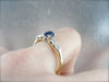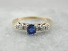 Absolutely stunning, this vintage engagement ring has a timeless, versatile style! The shoulders are set with scalloped white gold, inlaid with glittering diamonds. These bright decorations are a subtle compliment to the gorgeous sapphire at the center! True cobalt in color, this gleaming blue sapphire is faceted into a luscious oval, giving the stone a wonderful depth of light.