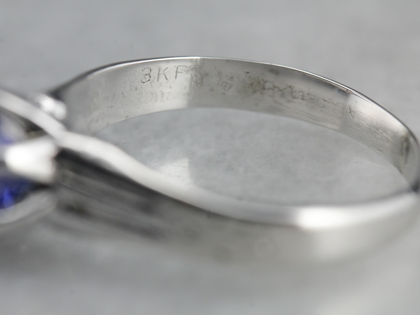 Oval cut sapphires such as this, with their sleek lines and curved corners, create an unbelievable air of elegance! Set in a simple etched mounting of white gold, no accents distract, and none are needed, from the gorgeous blue of the sapphire. Comfortable on the finger and laying close to the hand, this versatile ring is the perfect signature piece!