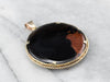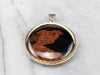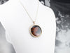 This impressive pendant is set with a sophisticated cut of agate, rich with earthy tones. Sienna brown inclusions display like a rock formation in a southwestern landscape, surrounded by a translucent backdrop as dark as the night sky. A bezel setting of 14 karat gold provides the perfect contrast for this earthy gemstone!