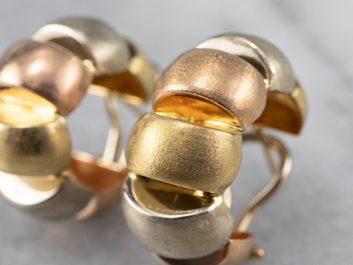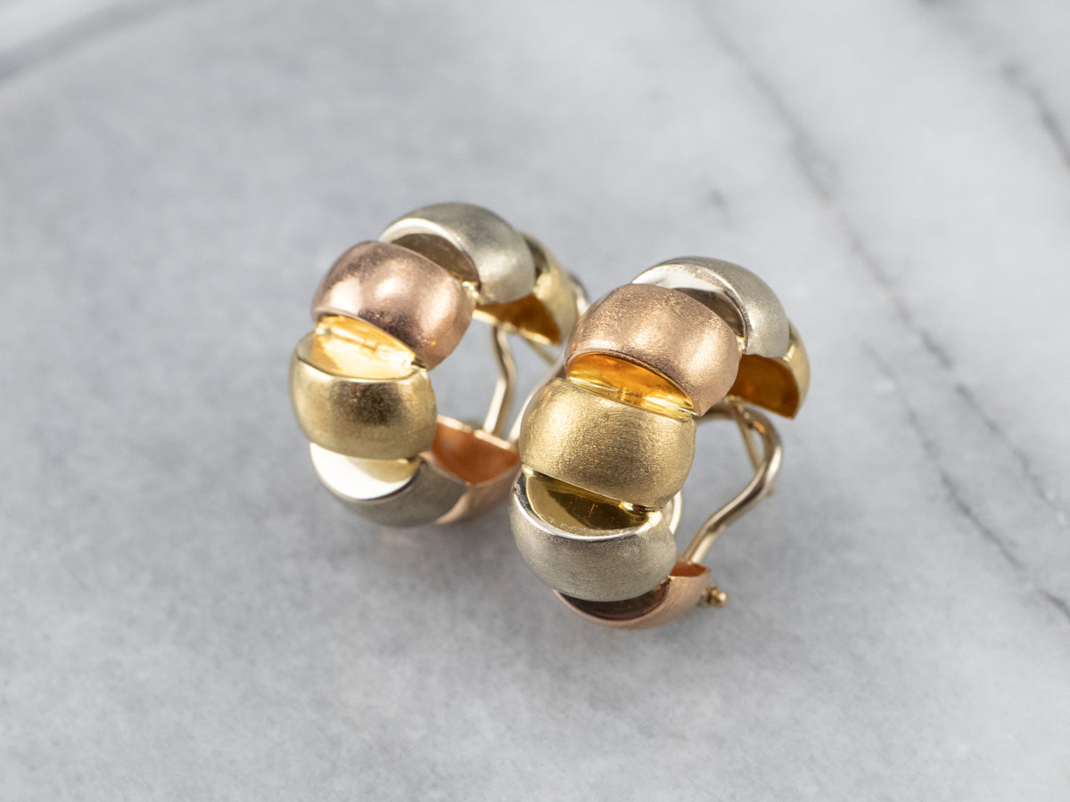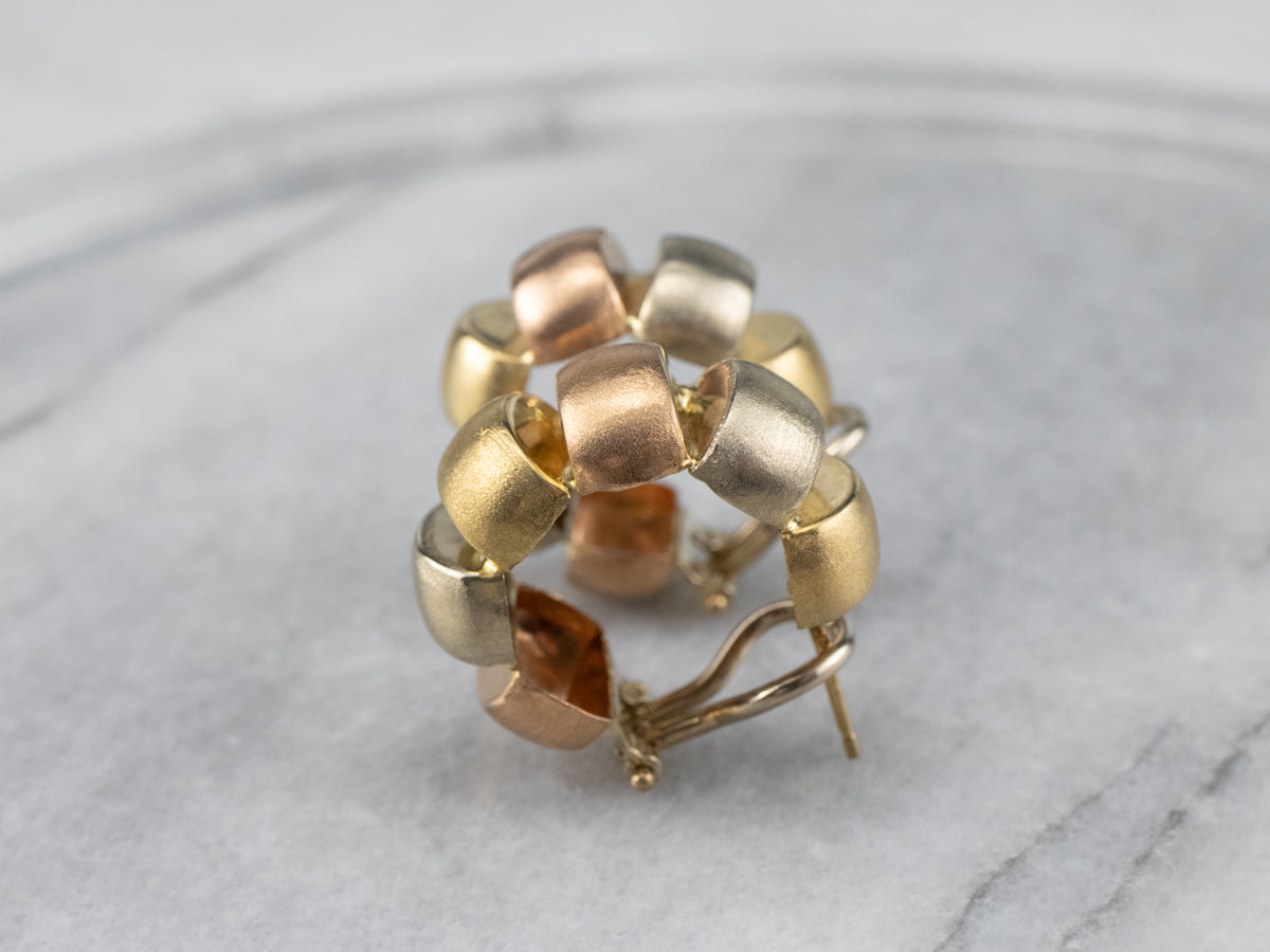 These stunning modern hoop earrings are crafted of brushed textures of white, rose, and yellow 18-karat gold. The latchback findings keep the earrings secure, allowing these to become your new go-to favorites!