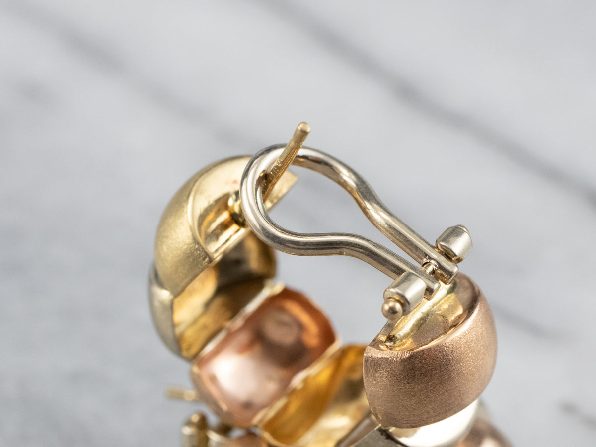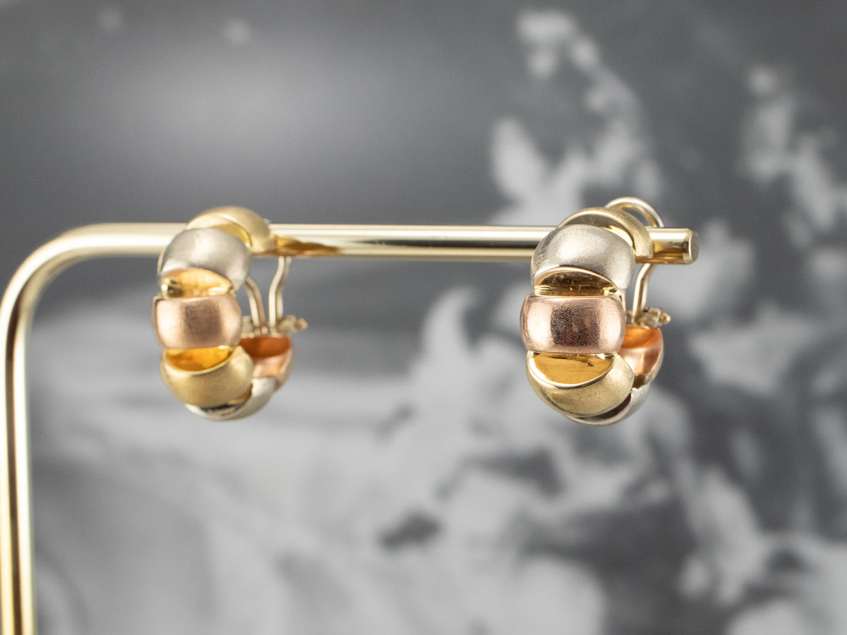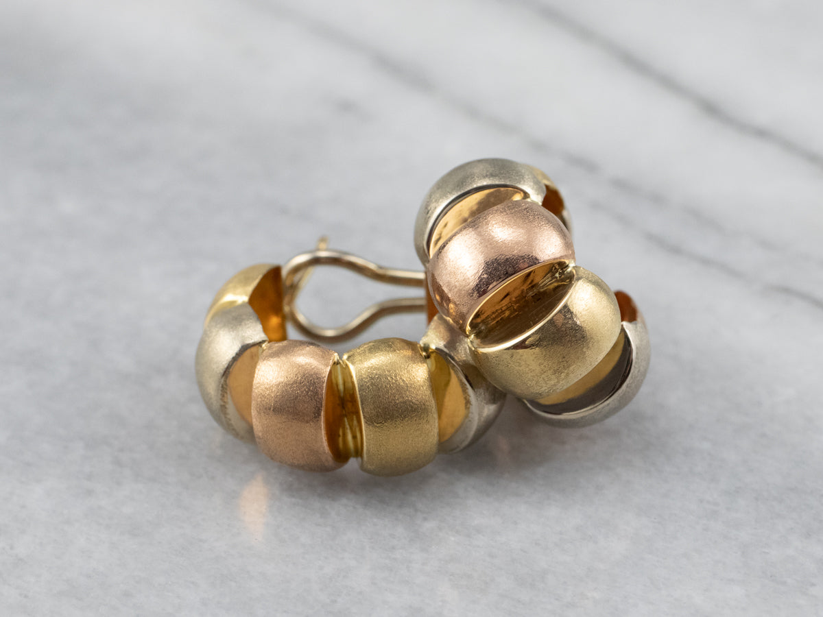 These stunning modern hoop earrings are crafted of brushed textures of white, rose, and yellow 18-karat gold. The latchback findings keep the earrings secure, allowing these to become your new go-to favorites!