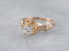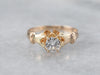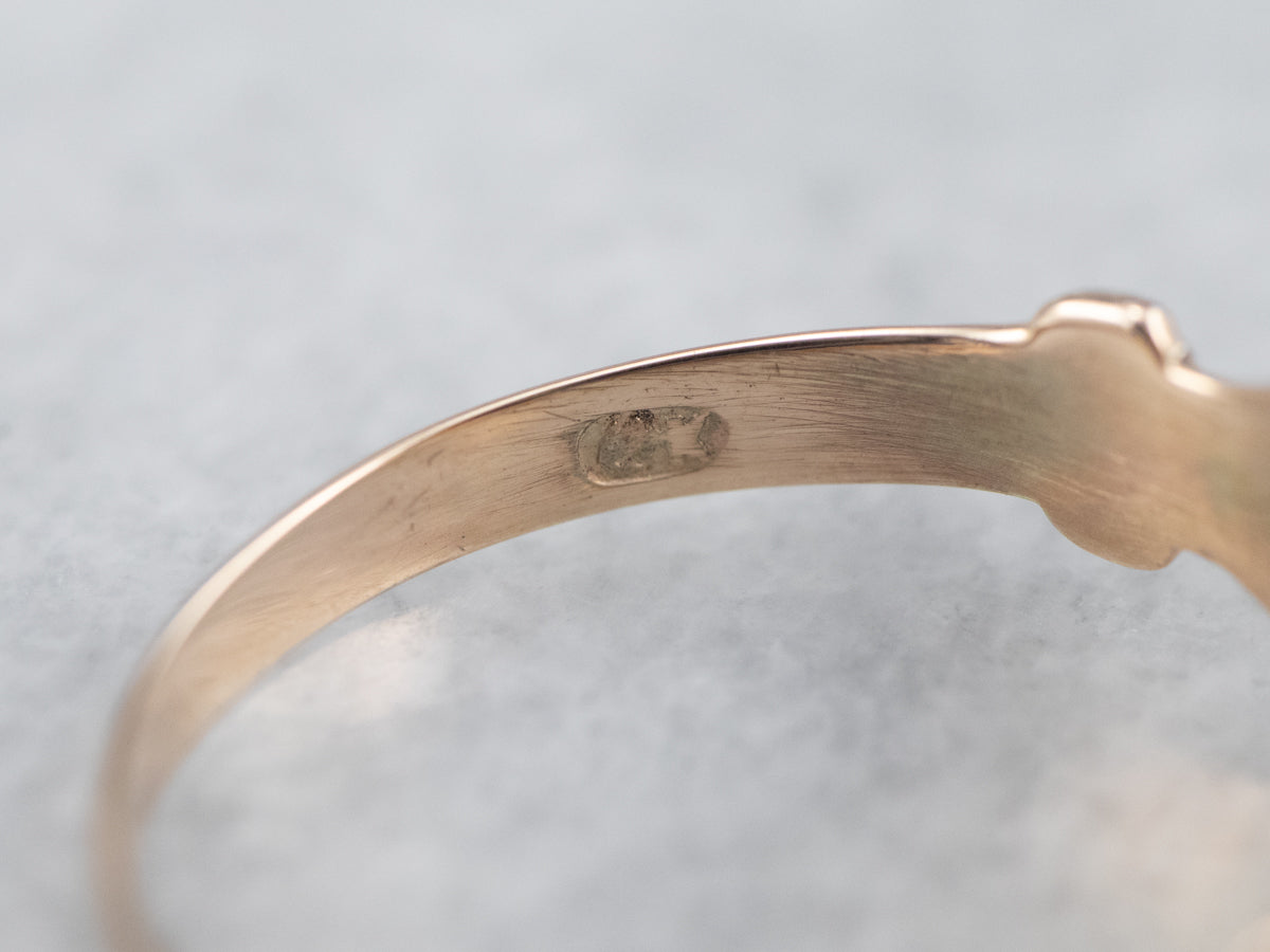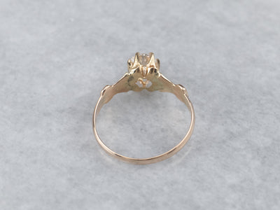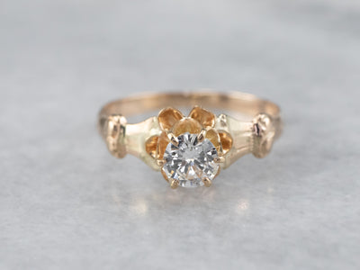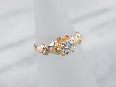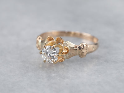 This antique engagement ring has been updated with a modern brilliant cut diamond! The sweet buttercup setting is complimented by subtle details along the shoulders of the ring, gleaming with a soft warmth in 10 karat gold. This ring is understated and elegant!