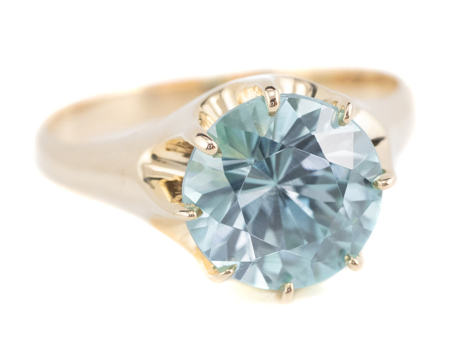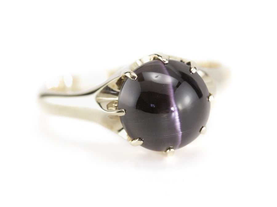 The Woodman setting features a Belcher style mounting is straight from the Victorian era. This style mounting is the perfect combination of modern size and antique design. The multiple prongs create a claw-like setting, allowing the sillimanite gemstone to sit, protected, just below the surface of the ring.