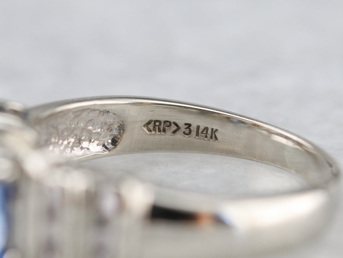 Modern in craftsmanship but vintage in design this is a stunning anniversary piece! Bright diamonds, sparkle down the stepped sides of the band, the bright stones are the perfect accent for the stunning Ceylon sapphire. The stone is a lovely periwinkle hued sapphire, with flashes of intense, saturated blue; a gorgeous combination with the white gold and diamonds. This can be worn as an engagement ring, a birthstone ring, or just for special occasions!