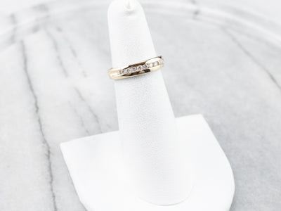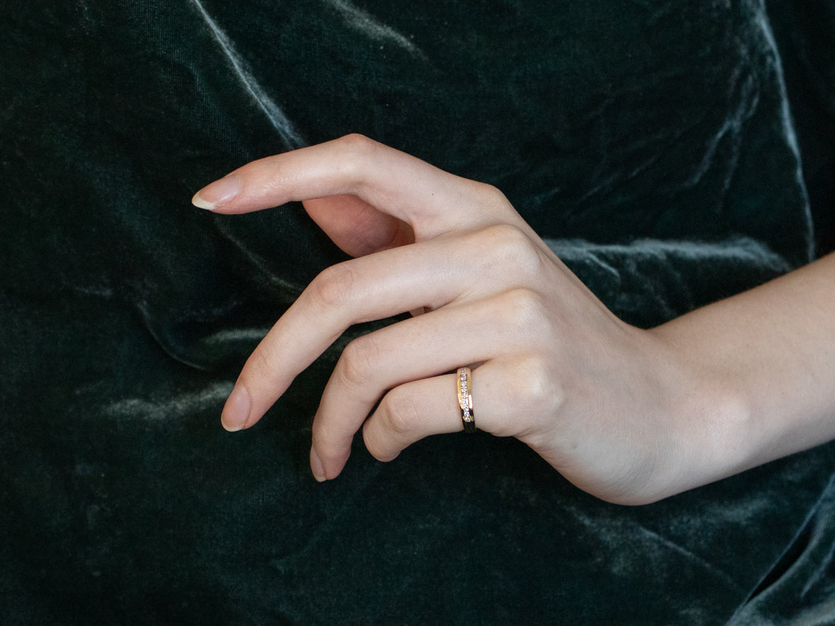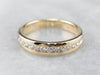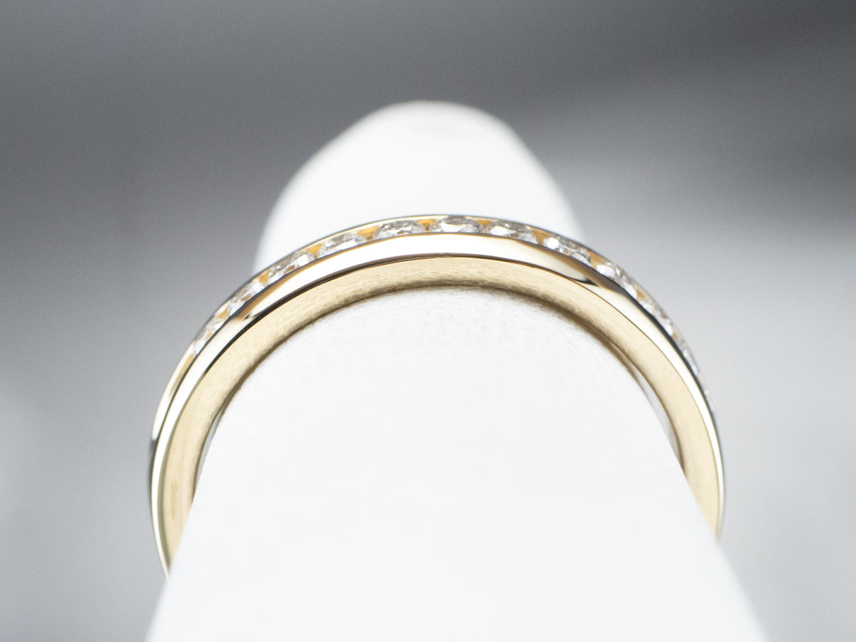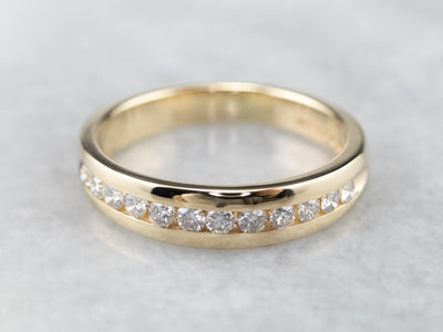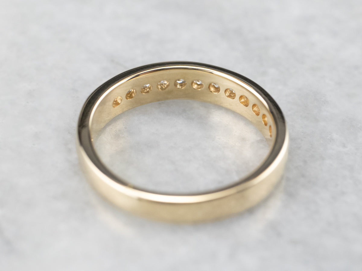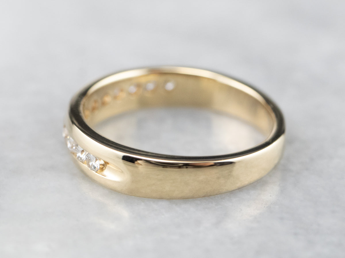 This channel set diamond band is well proportioned and comfortable on the hand. We love the long row of glittering round diamonds, filled with light and movement!
