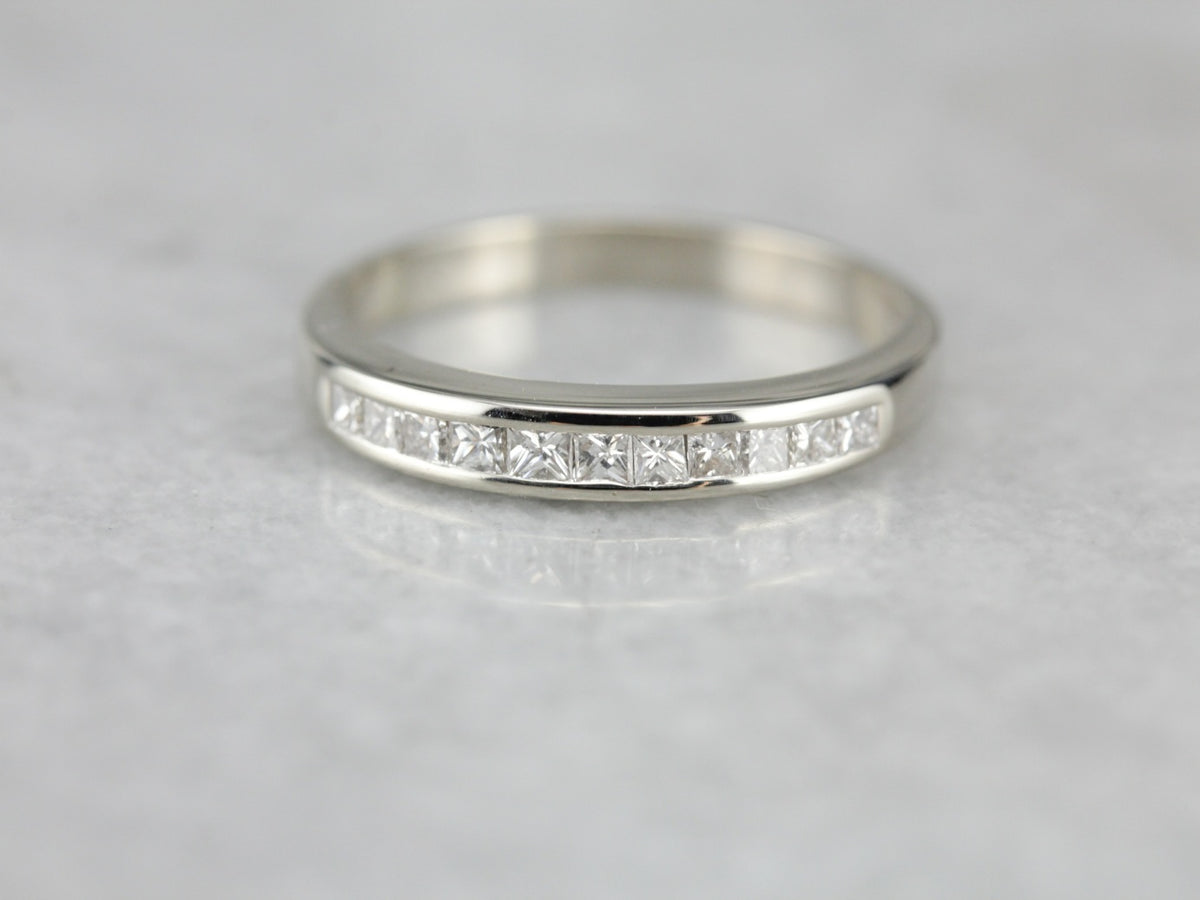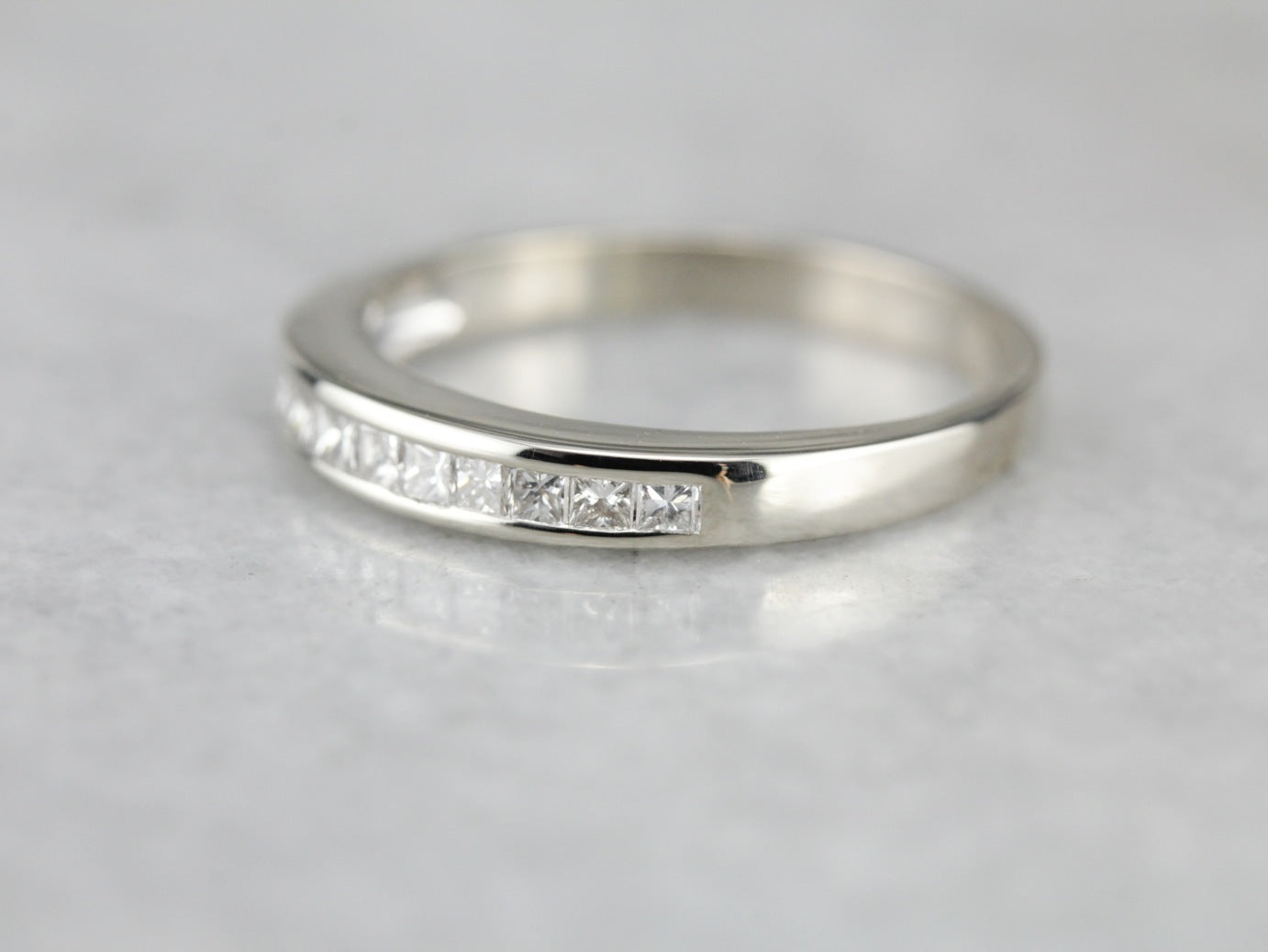 A classic, perfectly proportioned channel set diamond band never goes out of style, and goes with everything! Utterly lovely, this piece features a tapered profile on the finger, inlaid with graduated, perfectly proportioned diamonds!