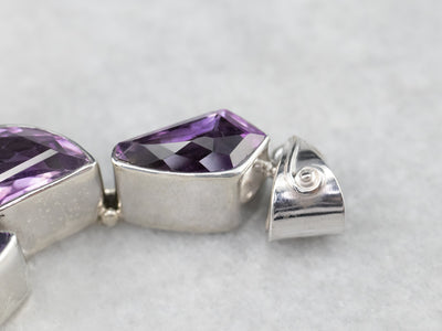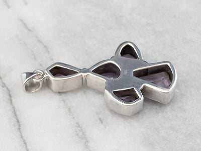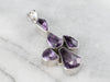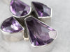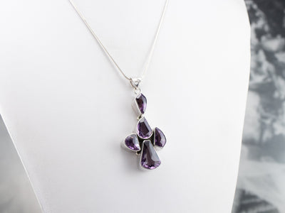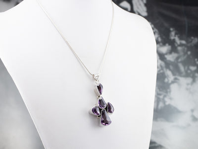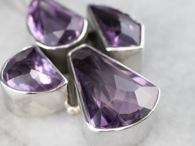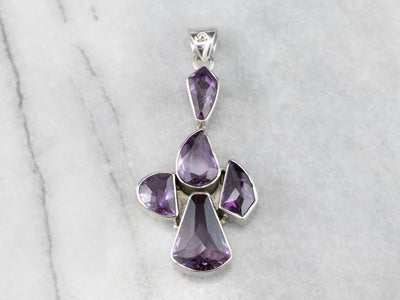 This chunky amethyst pendant has a modernist flair! Different fancy cuts of amethyst form a unique cluster design that is emphasized by a polished sterling silver frame. Wear this piece alone, or layer it with other necklaces for a boho look!