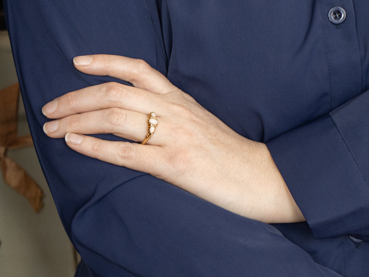 This gorgeous ring features bright antique bloomed gold, deeply and beautifully designed in a wide, low-slung Victorian style, accompanied by the sparkling old mine cut diamonds. The center of the ring has its original opal gemstones, which are extremely fine stones filled with fire and flash! A stunning piece ready to become part of your antique jewelry collection!