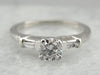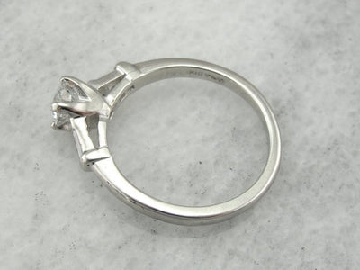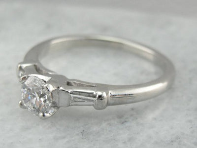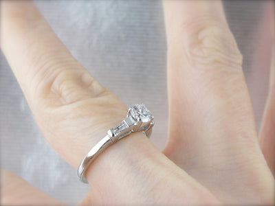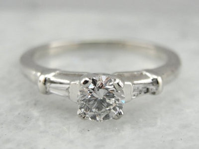 The style of this setting is timeless, a beautiful form that is elegant but eye catching! In an updated version of the classic solitaire, the center stone sits in four prongs, flanked on each side by a baguette cut diamond. The ultimate in timelessness, this ring will never go out of style and will be lovely alongside a wide variety of wedding bands!
