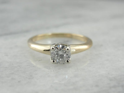 This vintage ring is made from 14 karat gold. The diamond is secured by delicate, yet sturdy prongs. The ring sits low on the finger which allows it to be extremely wearable while still allowing plenty of light underneath the stone for sparkle!