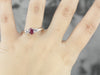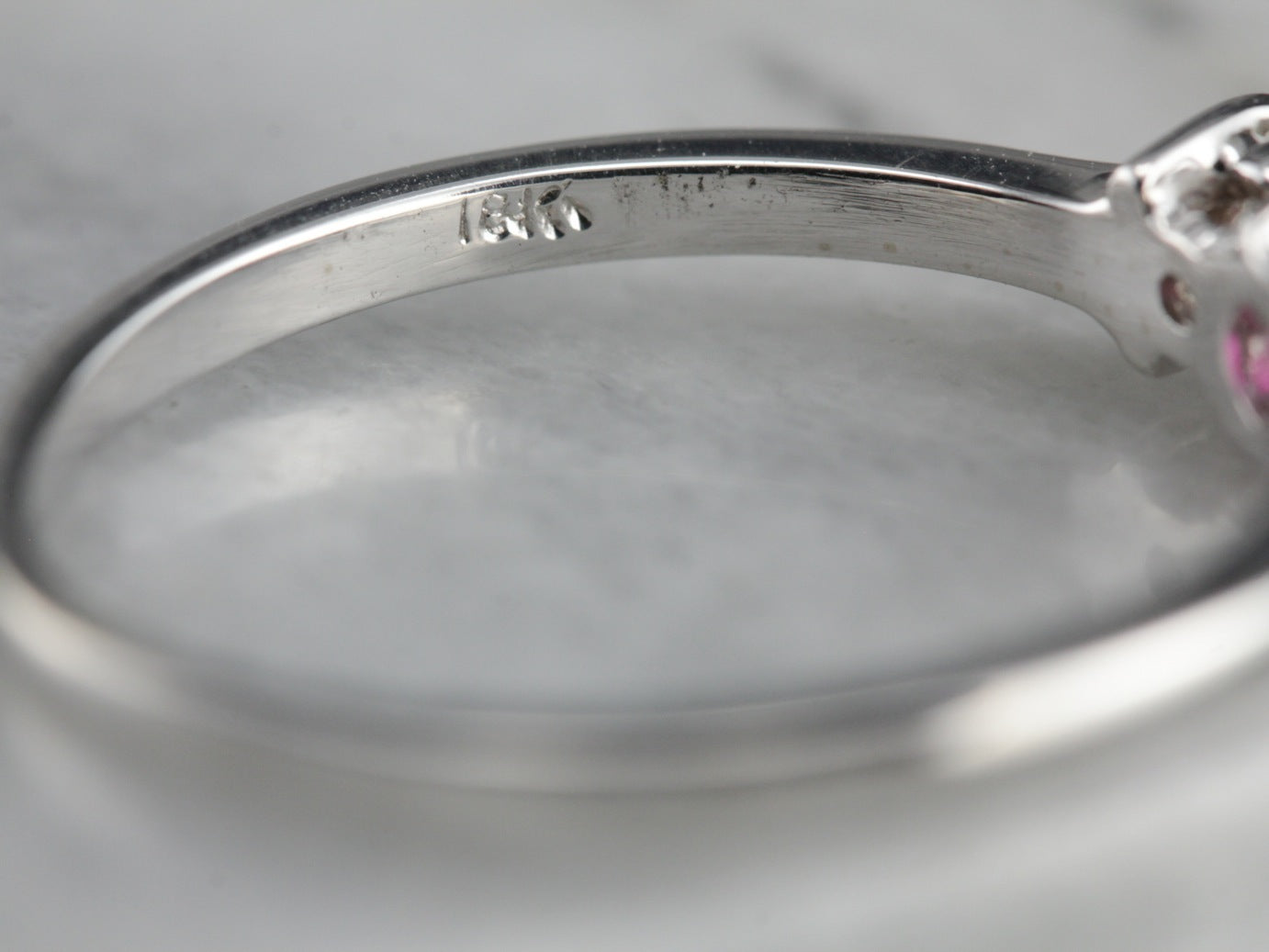 This simple mounting is classic and elegant; with a classic four prong head, polished white gold band, and two bright sparkly accent diamonds on each shoulder. This simplicity really lets the stone be the star of the show, and the stone itself is a beautiful unique color. It’s an oval cut, pink Sapphire, expertly cut to show off the beautiful color, flashing with tones of rose and lavender!