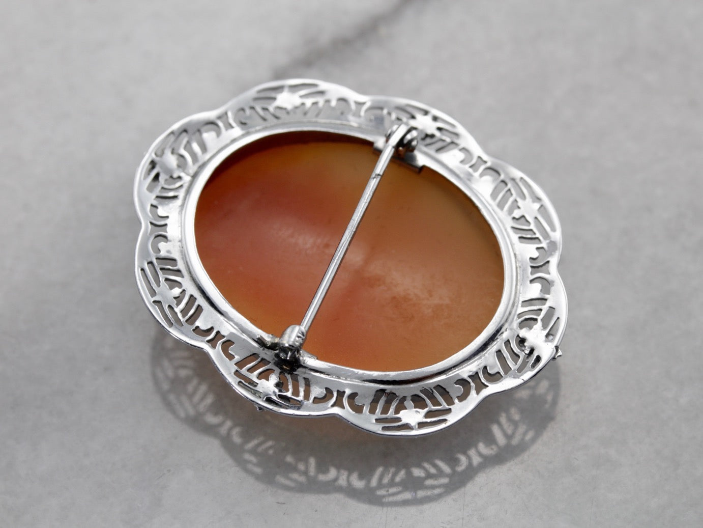 Classic Art Deco, this white gold pin has an overlay of bright white rhodium, giving it a glittering lacy appearance. The shell cameo is intricately carved, with the soft single petal roses in her hair echoed in the decoration of the framework.